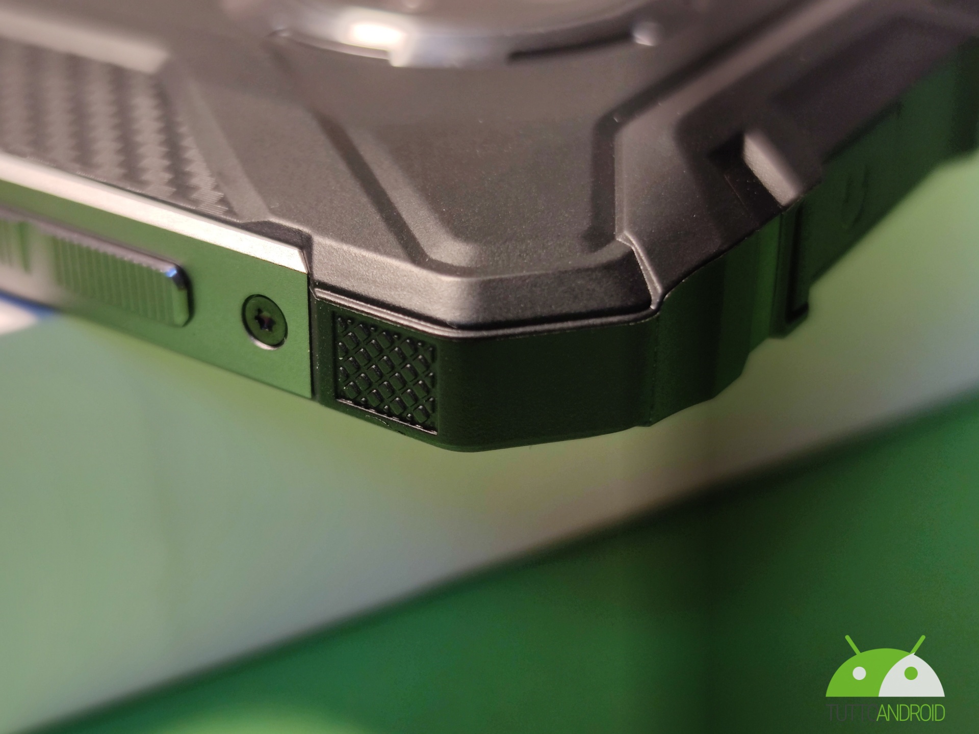 Da segnalare la presenza, nella confezione di vendita, di un cavo OTG per leggere unità disco esterne dallo smartphone e trasferire velocemente i propri dati. Il frame laterale è metallico, con delle viti Torx a tenere unito lo smartphone, mentre la parte superiore, quella inferiore e gli spigoli sono protetti da gomma.
