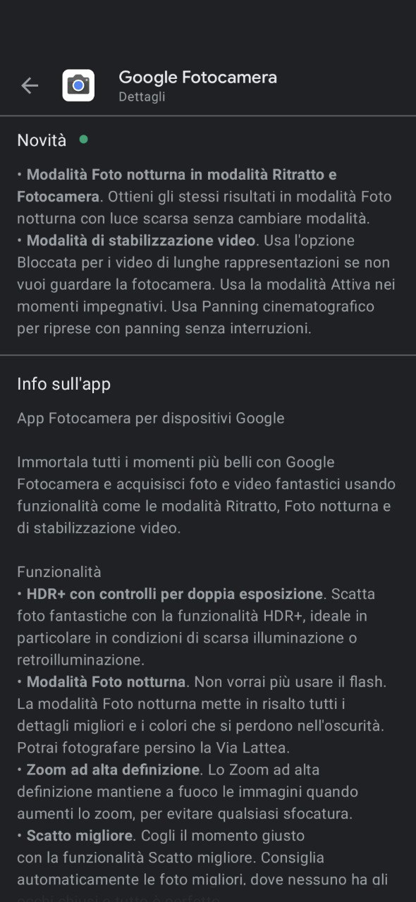 Le novità, dando uno sguardo al changelog, non sembrano nulla di che, ma in realtà sono abbastanza utili: al di là delle info sulle modalità della stabilizzazione video, che lasciano il tempo che trovano poiché c’erano già, c’è l’introduzione dall’attivazione automatica della modalità Foto notturna, anche in modalità Fotocamera e Ritratto.