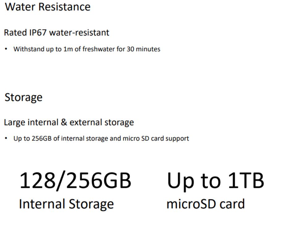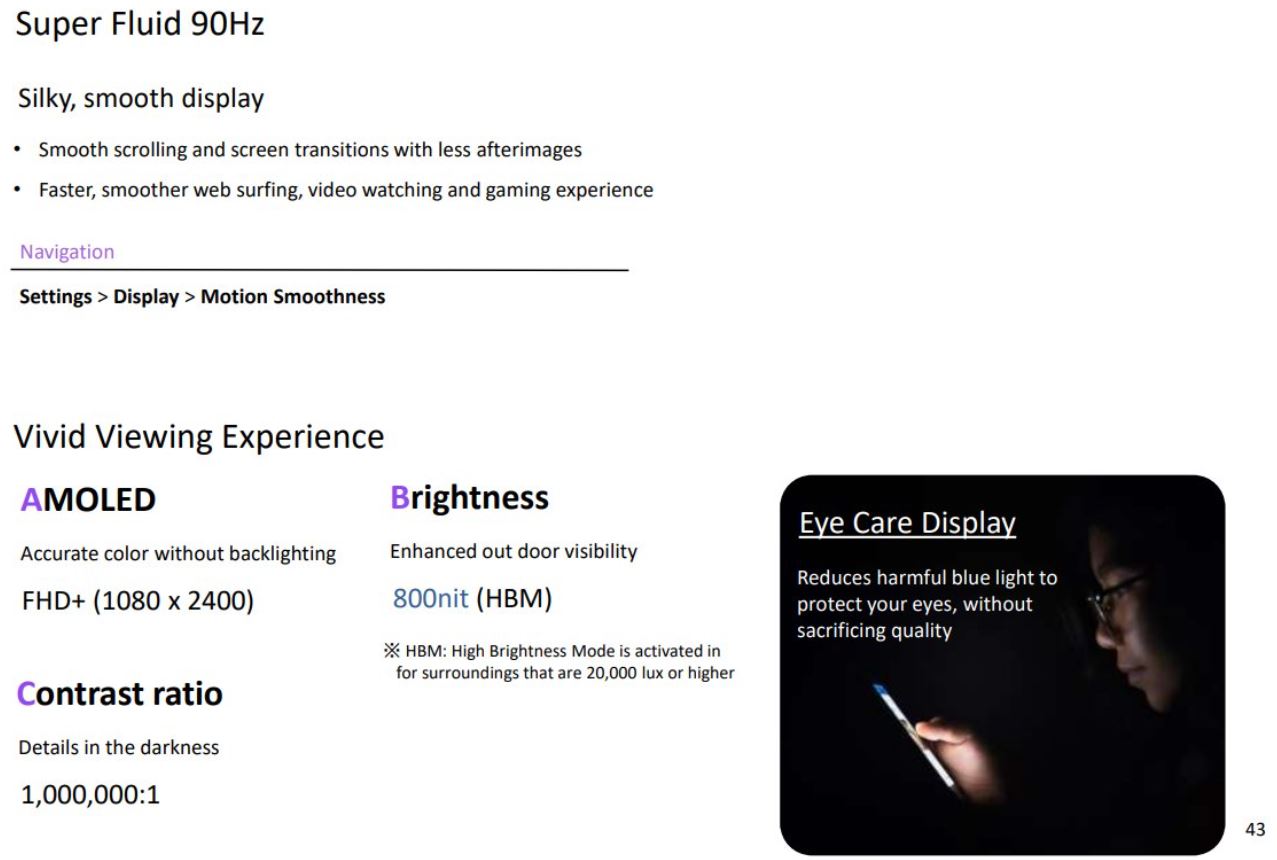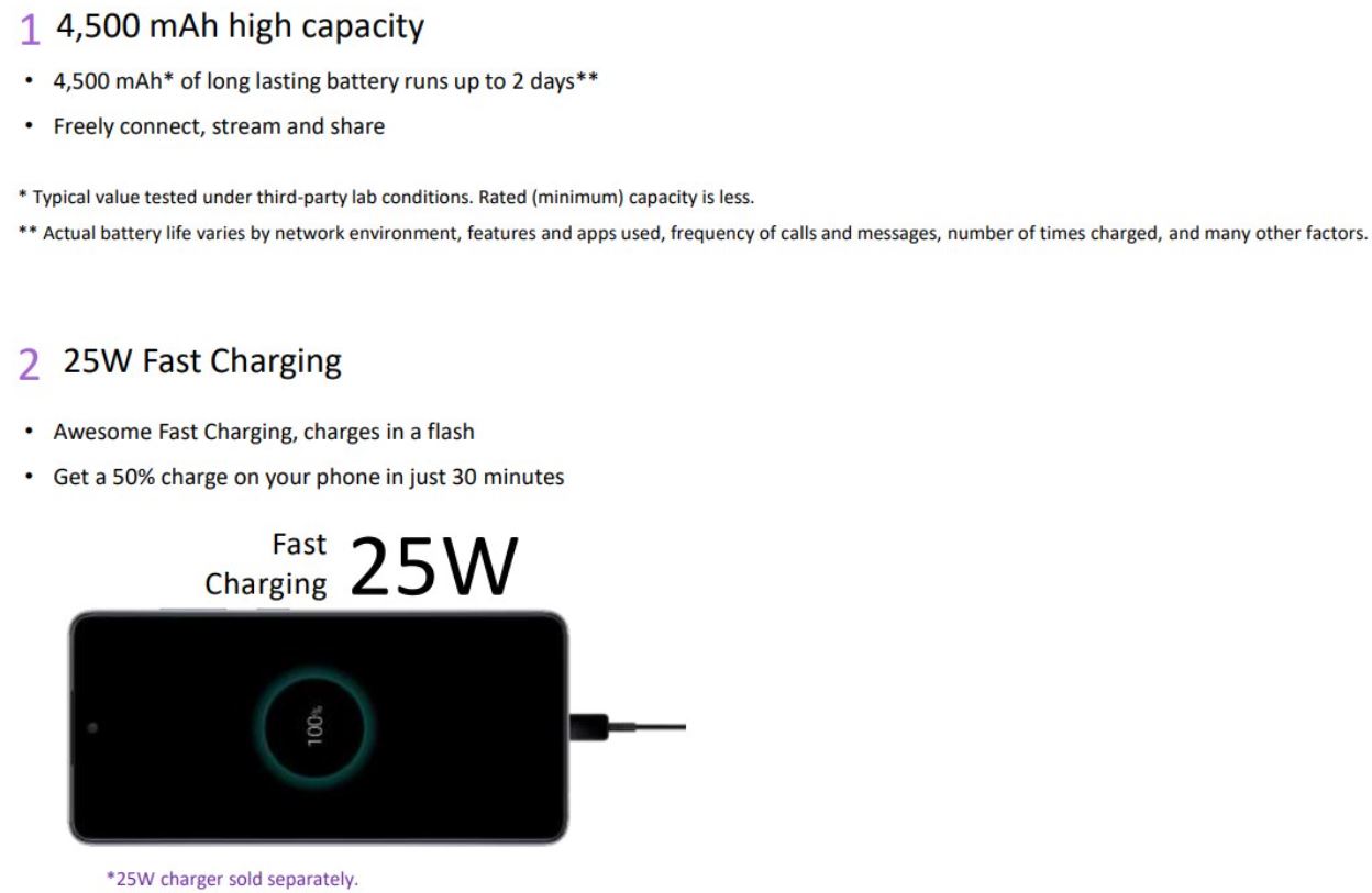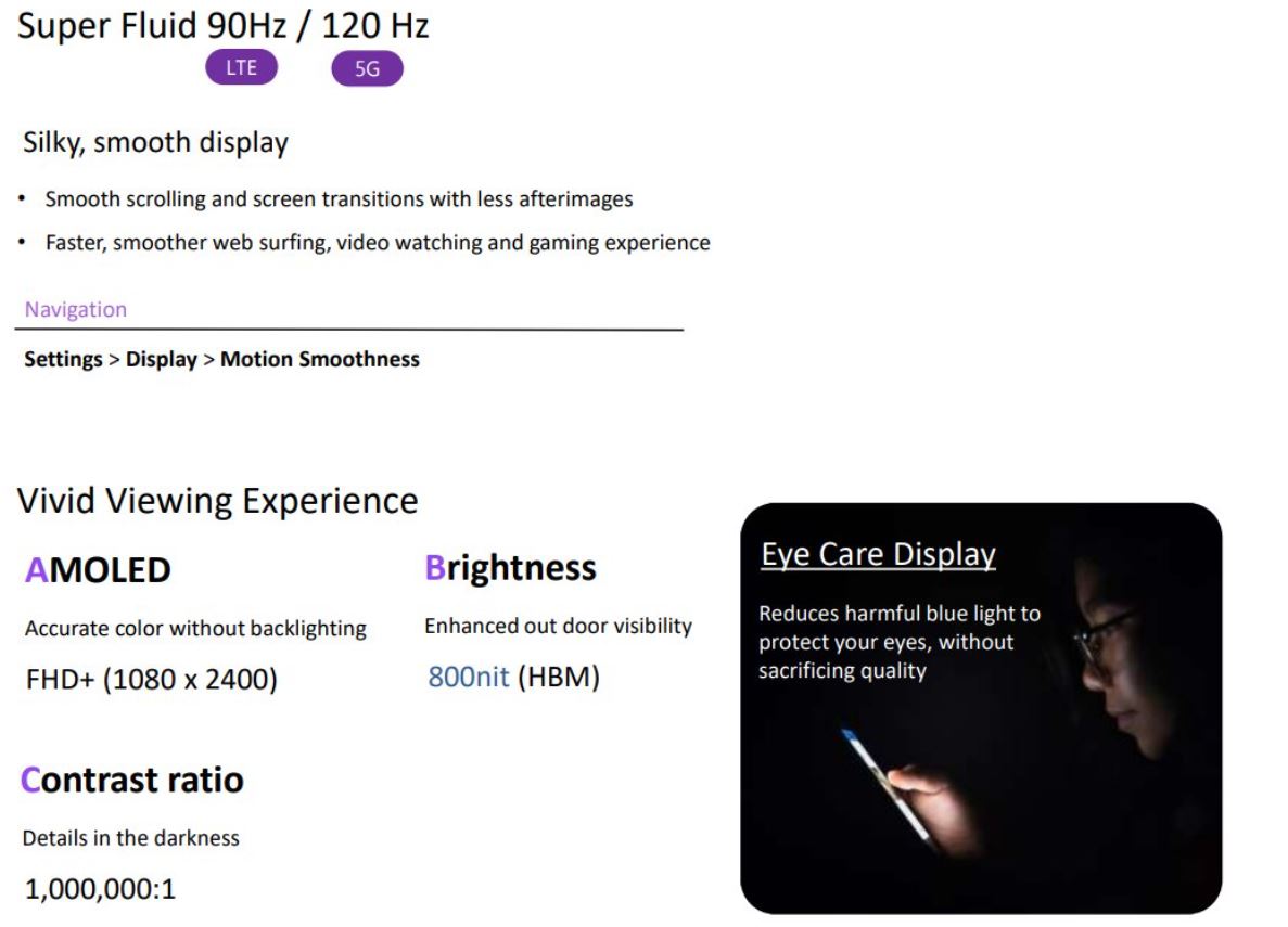Il modello più piccolo potrà invece contare su un display Super AMOLED da 6,5 pollici con refresh rate a 90 Hz (modello 4G) o 120 Hz (modello 5G), un processore Qualcomm Snapdragon 720G (modello 4G) o Qualcomm Snapdragon 750G (modello 5G), 4 GB, 6 GB o 8 GB di RAM e 128 GB o 256 GB di memoria integrata, una quadrupla fotocamera posteriore (con sensore primario da 64 megapixel, ultra grandangolare da 12 megapixel, di profondità da 5 megapixel e macro da 5 megapixel), una fotocamera frontale da 32 megapixel, una batteria da 4.500 mAh (con supporto alla ricarica rapida a 25 W) e una scocca con certificazione IP67.