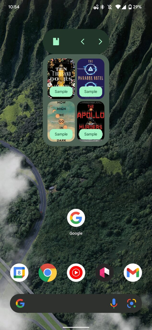 La griglia è capace di mostrare da quattro a otto libri e audiolibri, quest’ultimi contrassegnati dall’icona delle cuffie, oltre agli estratti opportunamente etichettati, mentre tutte le copertine presentano angoli arrotondati. Il widget può essere ridimensionato da 3×3 a 5×3 e presenta temi Dynamic Color.