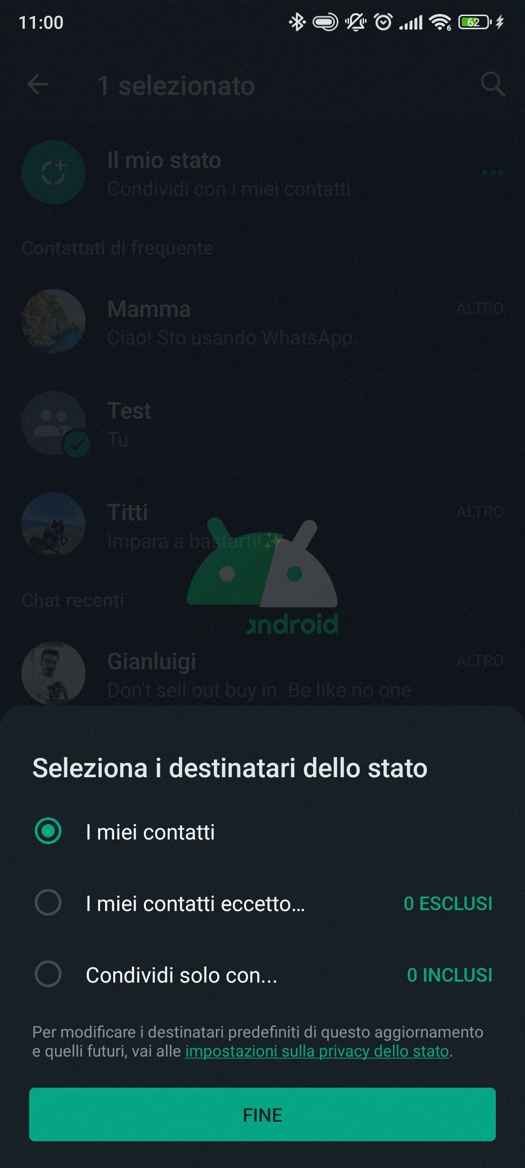 A proposito degli aggiornamenti di stato, anche la schermata che permette di scegliere a chi renderli visibili è stata ridisegnata. Mentre in precedenza era prevista tale possibilità soltanto in caso di aggiornamenti di stato creati dal tab Fotocamera (in questo caso, la sezione con le impostazioni sulla privacy compariva solo dopo l’aggiunta dello stato), l’ultimo aggiornamento di WhatsApp Beta permette di farlo molto comodamente in anticipo: basta toccare il tasto a tre punti visibile nello screenshot e selezionare i destinatari dello stato tra ‘I miei contatti’, ‘I miei contatti eccetto…’ e ‘Condividi solo con…’; non manca un link alle impostazioni sulla privacy dello stato.