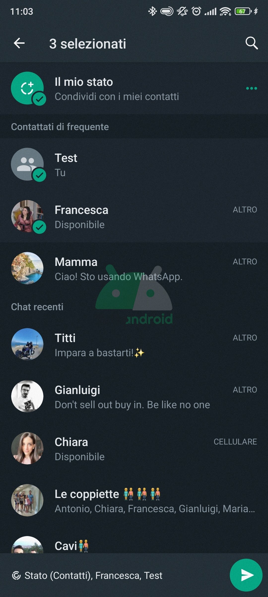 Come potete vedere dagli screenshot riportati di seguito, il team di WhatsApp ha provveduto a ridisegnare l’interfaccia che viene visualizzata quando si invia un file multimediale, in particolare adesso viene messo in evidenza il nome del destinatario. Ma non si tratta di una mera modifica grafica fine a se stessa, bensì di una novità pratica molto utile: mentre in precedenza non era possibile selezionare dei diversi destinatari durante l’invio di file multimediali all’interno di una chat — lo si poteva fare soltanto dal tab Fotocamera —, adesso questa possibilità è sempre a portata di tap. Che stia inviando una foto, un video o una GIF in una chat, entrato nella schermata che consente di aggiungere l’eventuale didascalia, l’utente non deve fare altro che toccare il nome del destinatario per aprire una pagina che permette di selezionarne altri — suddivisi in Contattati di frequente, Chat recenti e Altri contatti — e per condividere lo stesso file come Stato.
