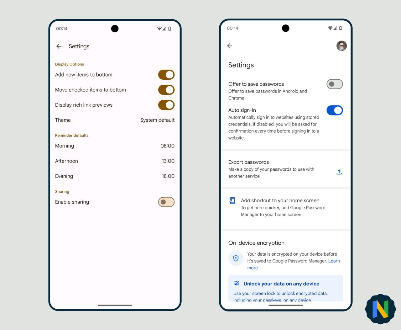In Google Keep possiamo notarli all’interno delle impostazioni, nelle sezioni “Opzioni di visualizzazione“, “Impostazioni predefinite promemoria” e “Condivisione“. Discorso simile per il Gestore delle password, come possiamo vedere negli screenshot qui in basso.