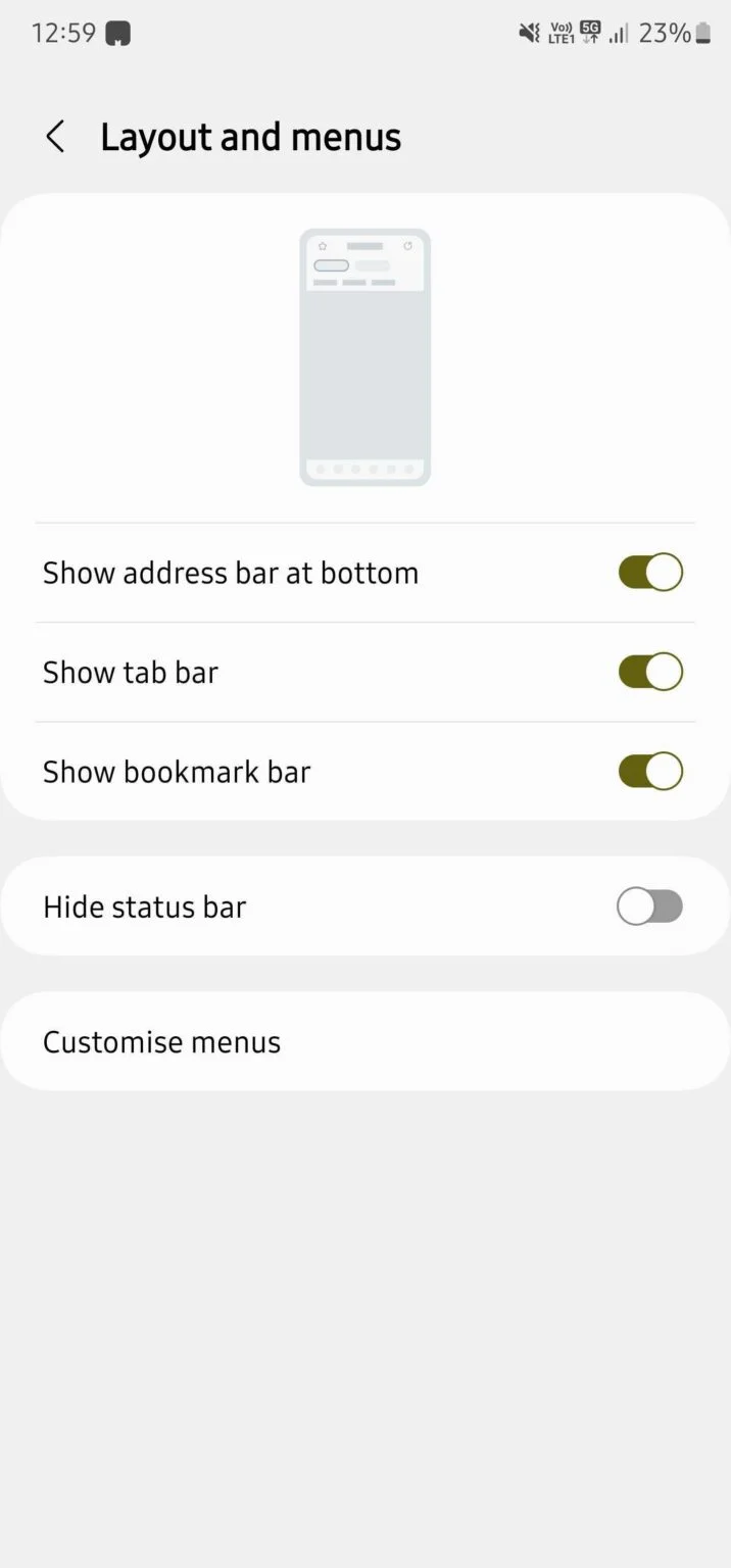 Il cambiamento introdotto va a favorire l’usabilità di Samsung Internet Beta su smartphone e tablet, rendendo gli elementi menzionati più facili da raggiungere, soprattutto sugli schermi dalle diagonali più generose. Infatti, il produttore ha introdotto la possibilità di mostrare la barra dei preferiti e quella delle schede nella porzione inferiore della schermata. Le opzioni da abilitare trovano posto nel menu apposito: basta aprire Samsung Internet Beta, accedere alle Impostazioni e poi alla sezione Layout e menu. Come potete vedere dagli screenshot riportati di seguito, una volta abilitate le nuove opzioni introdotte, la barra dei preferiti e quella delle schede vengono riposizionate in basso, giusto al di sopra di quella degli URL (a patto di aver spostato anche quest’ultima nella parte bassa dello schermo).