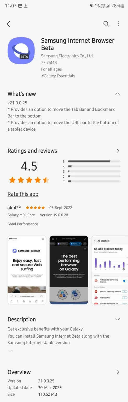 La versione più aggiornata di Samsung Internet Beta è già disponibile al download tramite il Galaxy Store a questo link, l’aggiornamento pesa 110,52 MB. La stessa app è scaricabile dal Google Play Store tramite il badge sottostante, anche se l’ultimo aggiornamento non è ancora disponibile.