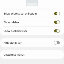 Il cambiamento introdotto va a favorire l’usabilità di Samsung Internet Beta su smartphone e tablet, rendendo gli elementi menzionati più facili da raggiungere, soprattutto sugli schermi dalle diagonali più generose. Infatti, il produttore ha introdotto la possibilità di mostrare la barra dei preferiti e quella delle schede nella porzione inferiore della schermata. Le opzioni da abilitare trovano posto nel menu apposito: basta aprire Samsung Internet Beta, accedere alle Impostazioni e poi alla sezione Layout e menu. Come potete vedere dagli screenshot riportati di seguito, una volta abilitate le nuove opzioni introdotte, la barra dei preferiti e quella delle schede vengono riposizionate in basso, giusto al di sopra di quella degli URL (a patto di aver spostato anche quest’ultima nella parte bassa dello schermo).