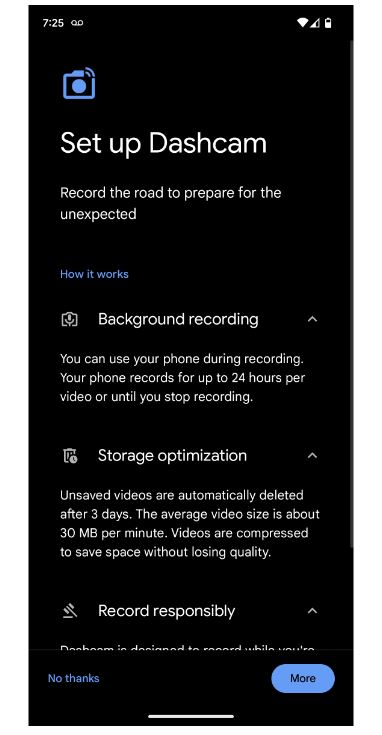 Pare che nelle scorse ore il colosso di Mountain View abbia rilasciato per errore una versione dogfood di Emergenze Personali (la versione 2023.04.27.532191641.8-dogfood) che consente di abilitare una nuova funzionalità chiamata “Dashcam”.