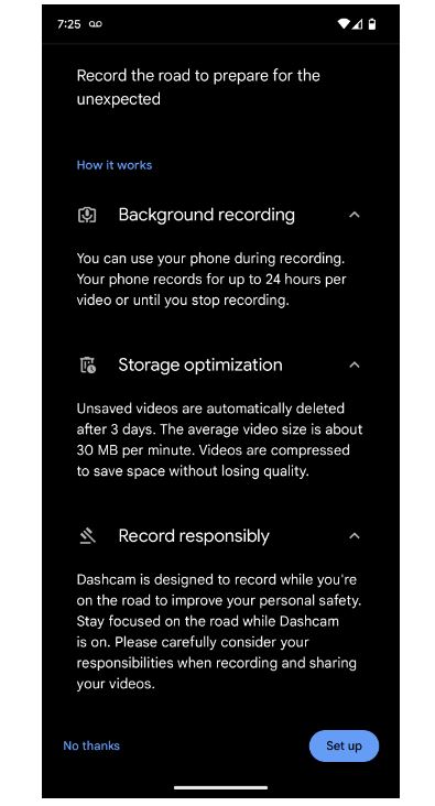 Mentre la funzionalità Dashcam sta registrando, il telefono è ancora completamente utilizzabile, anche per la navigazione con Google Maps. In alternativa, gli utenti hanno la possibilità di risparmiare energia bloccando lo schermo (la registrazione continuerà).