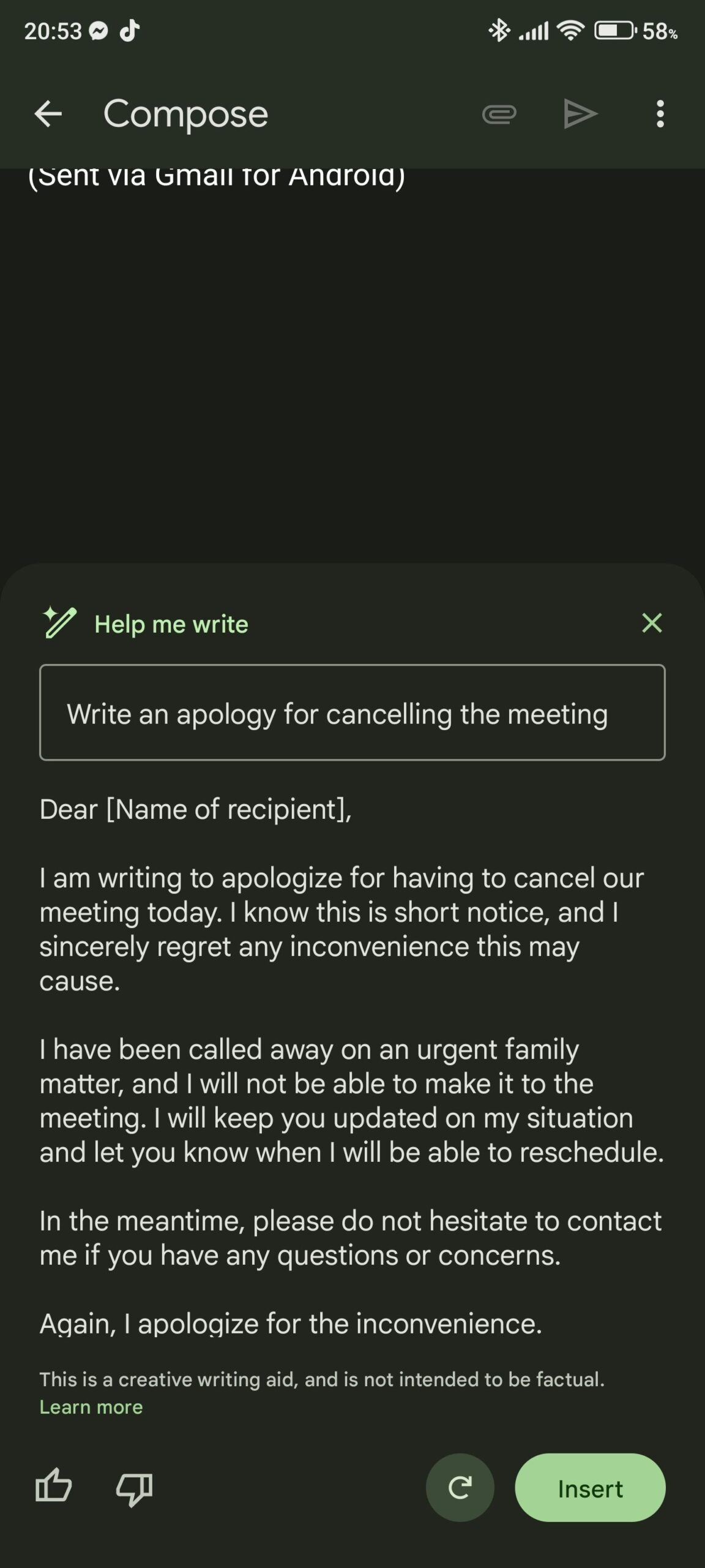 Nella parte inferiore dell’interfaccia è possibile trovare i classici pulsanti “Mi piace” e “Non mi piace” che permettono all’utente di esprimere un giudizio sulla bozza generata; sul lato sinistro, invece, fa la sua comparsa il pulsante “Inserisci” che consente di copiare direttamente il testo generato nella bozza dell’e-mail, dove è possibile apportare ulteriori modifiche, se necessario.