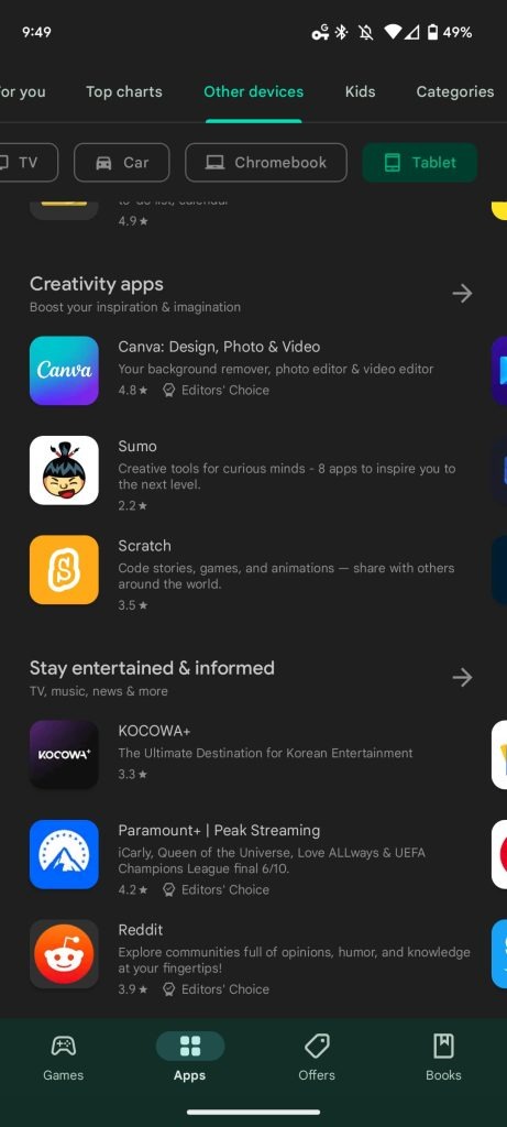 Nel mese di settembre il gigante di Mountain View ha introdotto una nuova scheda superiore nel Play Store denominata “Altri dispositivi”. Questa nuova sezione permette di esplorare le applicazioni create per una varietà di dispositivi, tra cui smartwatch con Wear OS, TV e automobili (Automotive), e persino giochi. L’innovazione più rilevante, però, riguarda l’integrazione delle sezioni specifiche per Chromebook e Tablet, posizionate in cima al feed delle applicazioni.