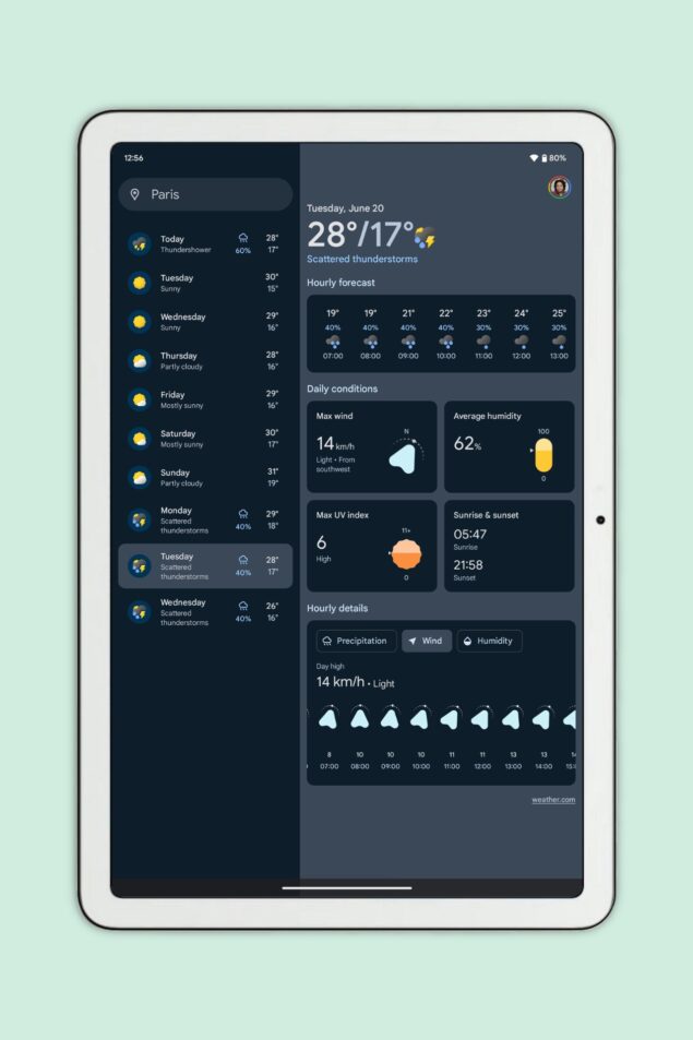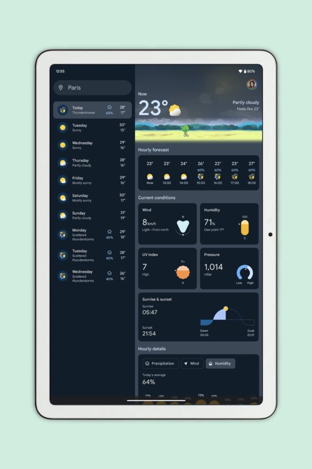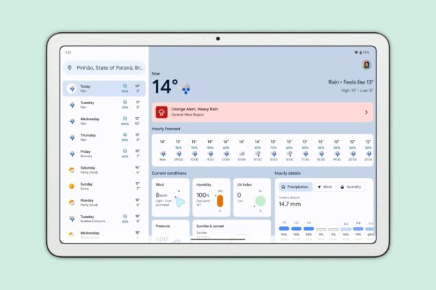 Una delle protagoniste di queste riprogettazioni è l’app Google Meteo che, dopo essersi mostrata in azione lo scorso mese a bordo del Pixel Fold, debutta finalmente sul primo tablet Made by Google.