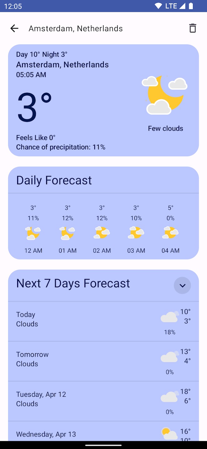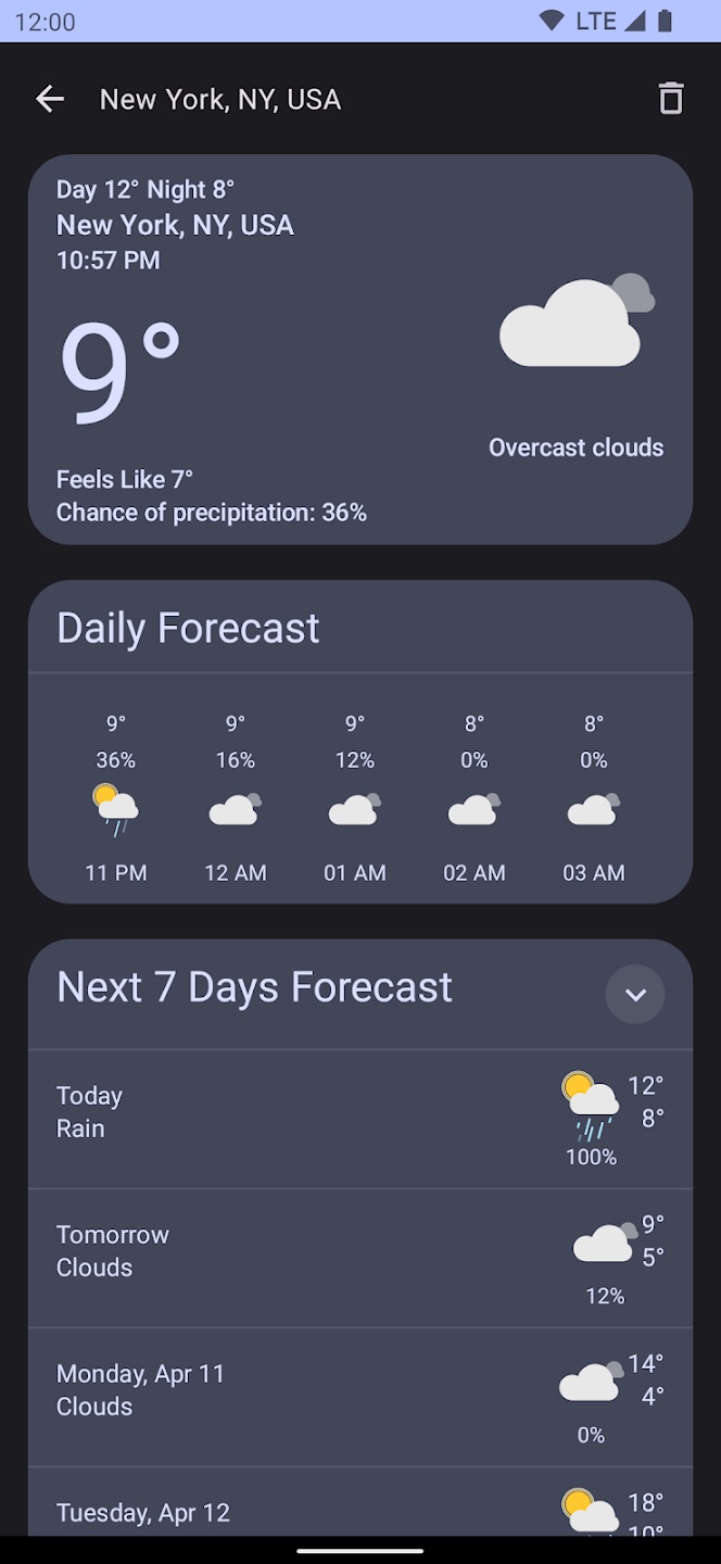 L’app offre la possibilità di consultare le previsioni del tempo fino a sette giorni in varie località mostrando una scheda riepilogativa con le temperature minime e massime, la temperatura e le condizioni del tempo attuali, la temperatura percepita e la probabilità di precipitazioni.