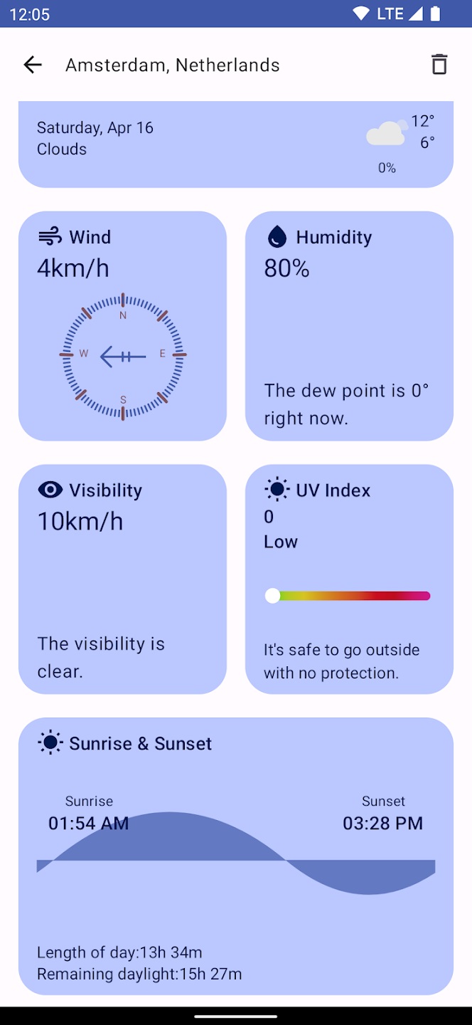 L’app fornisce anche informazioni relative alla velocità del vento, la percentuale di umidità, la distanza di visibilità, l’indice UV e gli orari di alba e tramonto, il tutto all’interno di un’interfaccia utente minimale che supporta il tema chiaro e scuro.