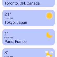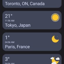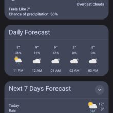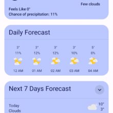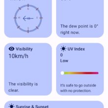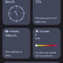 L’app fornisce anche informazioni relative alla velocità del vento, la percentuale di umidità, la distanza di visibilità, l’indice UV e gli orari di alba e tramonto, il tutto all’interno di un’interfaccia utente minimale che supporta il tema chiaro e scuro.