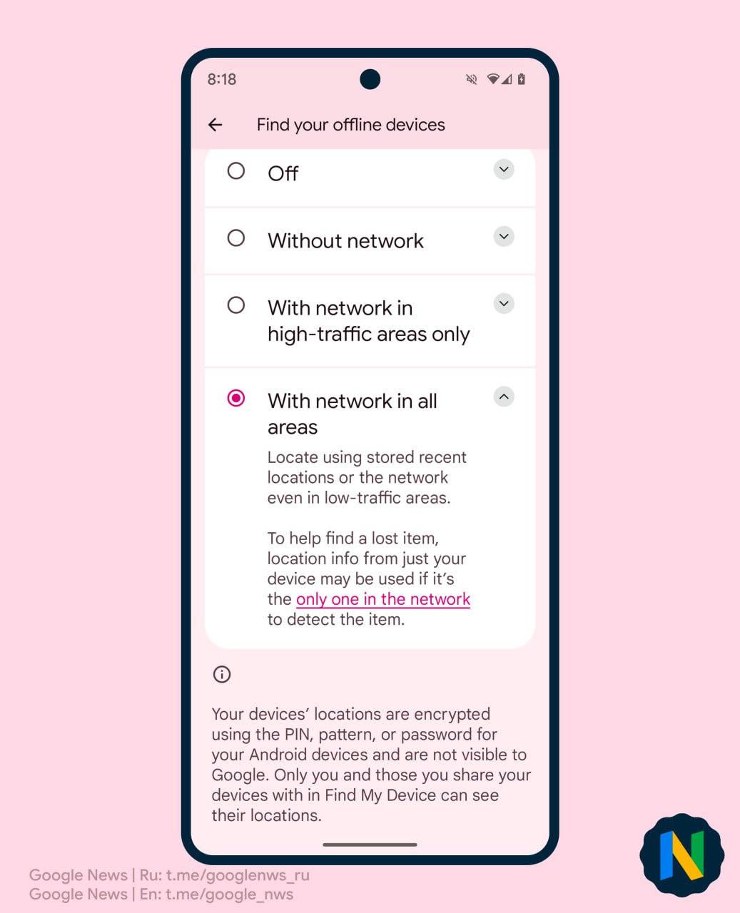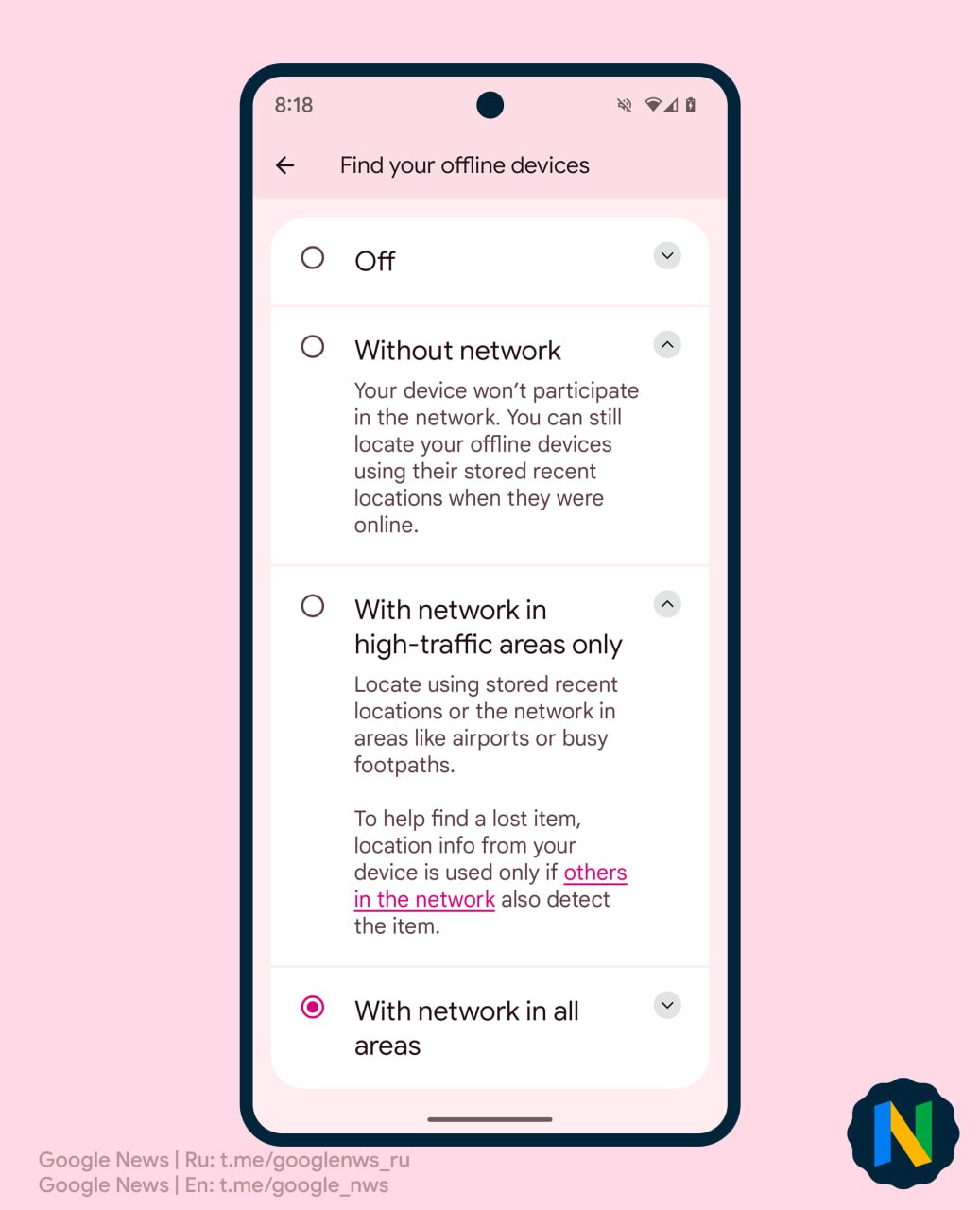 Ebbene, grazie al solito canale Telegram Google News abbiamo qualche anticipazione di come dovrebbe essere il nuovo menu, che a quanto pare sarà reso disponibile nelle impostazioni. La funzione dovrebbe prendere il nome “Find your offline devices” e permetterà di scegliere tra quattro opzioni, che possiamo vedere negli screenshot qui sotto.