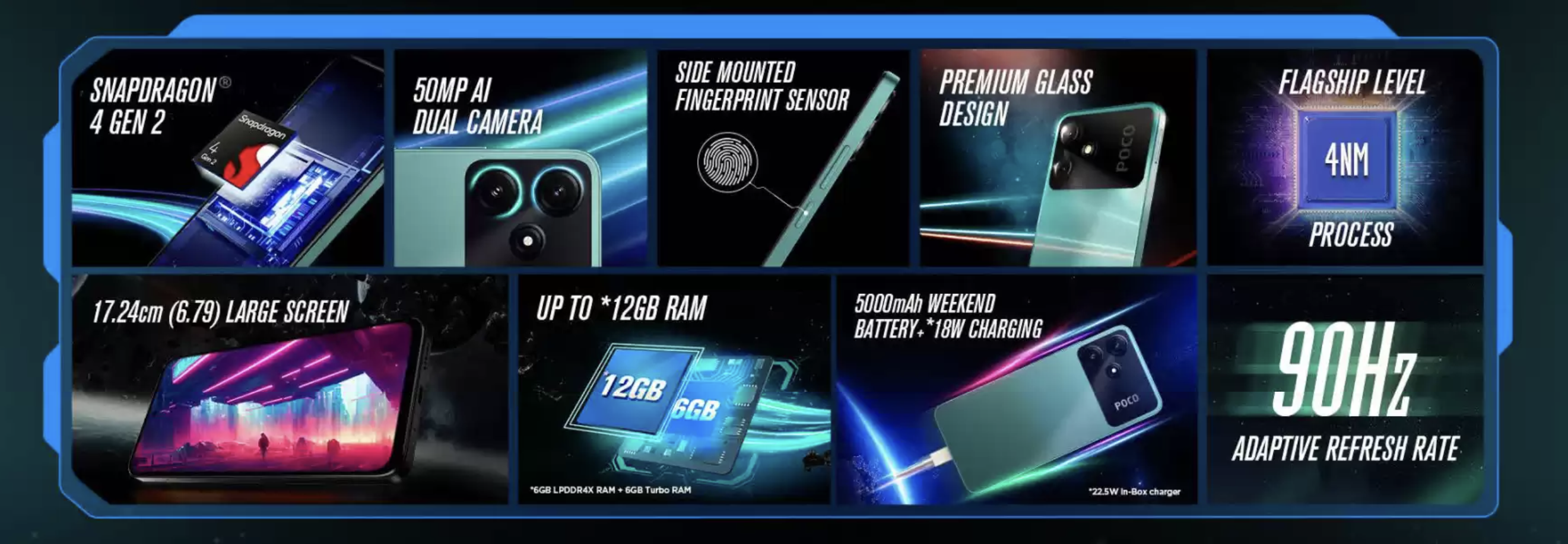 Passando alla dotazione tecnica, spiccano il display LCD IPS da 6,79 pollici a 90 Hz, la Mobile Platform Snapdragon 4 Gen 2 di Qualcomm, la RAM dichiarata fino a 12 GB — frutto di 6 GB di RAM LPDDR4X e 6 GB di Turbo RAM —, la fotocamera principale da 50 MP e la batteria da 5.000 mAh con supporto ad una ricarica non particolarmente rapida (si ferma a 18 W). Senza ulteriori indugi, ecco la scheda tecnica completa di POCO M6 Pro 5G: