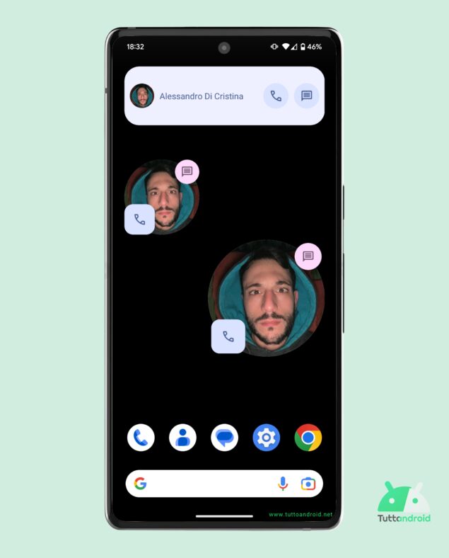 Esso oggi si presenta (per impostazione predefinita) come un’icona circolare 2×2 contenente l’immagine del profilo del contatto con, sovrapposti, i pulsanti di chiamata e messaggio (collocati, rispettivamente, in basso a sinistra e in alto a destra). Ovviamente, nel caso in cui il widget viene ridimensionato a una sola riga, cambia profondamente (potete apprezzare le differenze nella prima immagine della galleria sottostante).