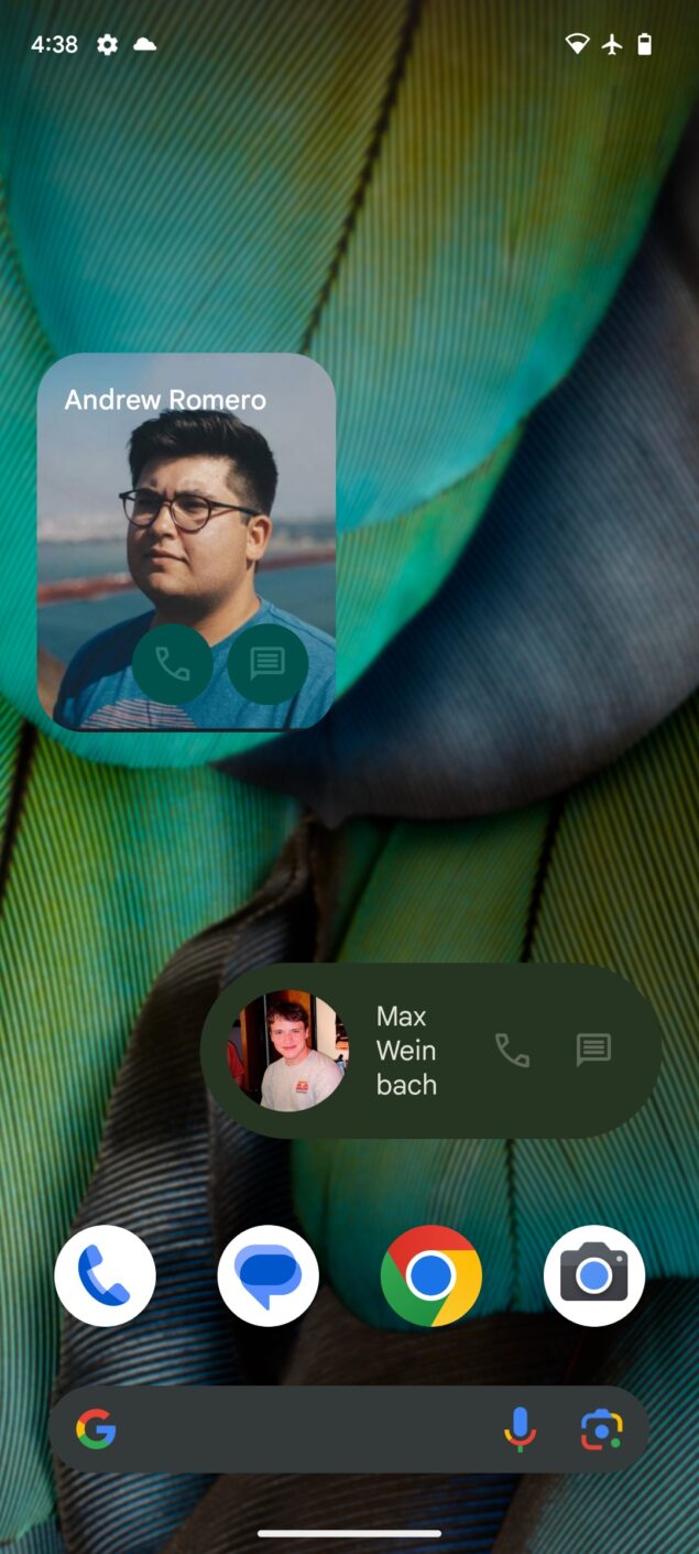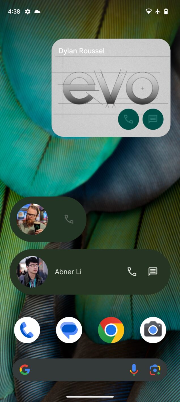 Il widget sarà presto rinnovato (via 9to5Google) in modo che i pulsanti di chiamata e messaggio trovino spazio all’interno dell’icona (non più circolare ma rettangolare con angoli arrotondati), risultando meno vistosi e un pelo confusi con lo sfondo (seconda e terza immagine della galleria sottostante). Non è chiaro quando (e se) questo nuovo design sarà implementato per tutti.