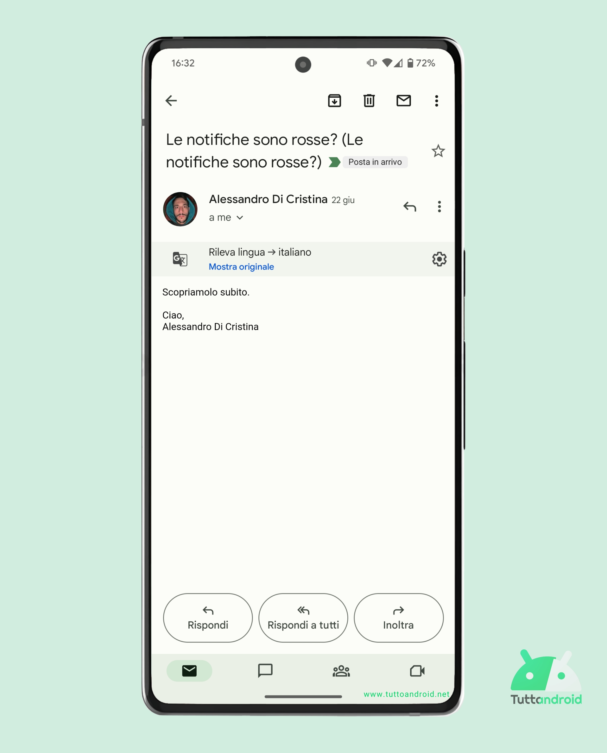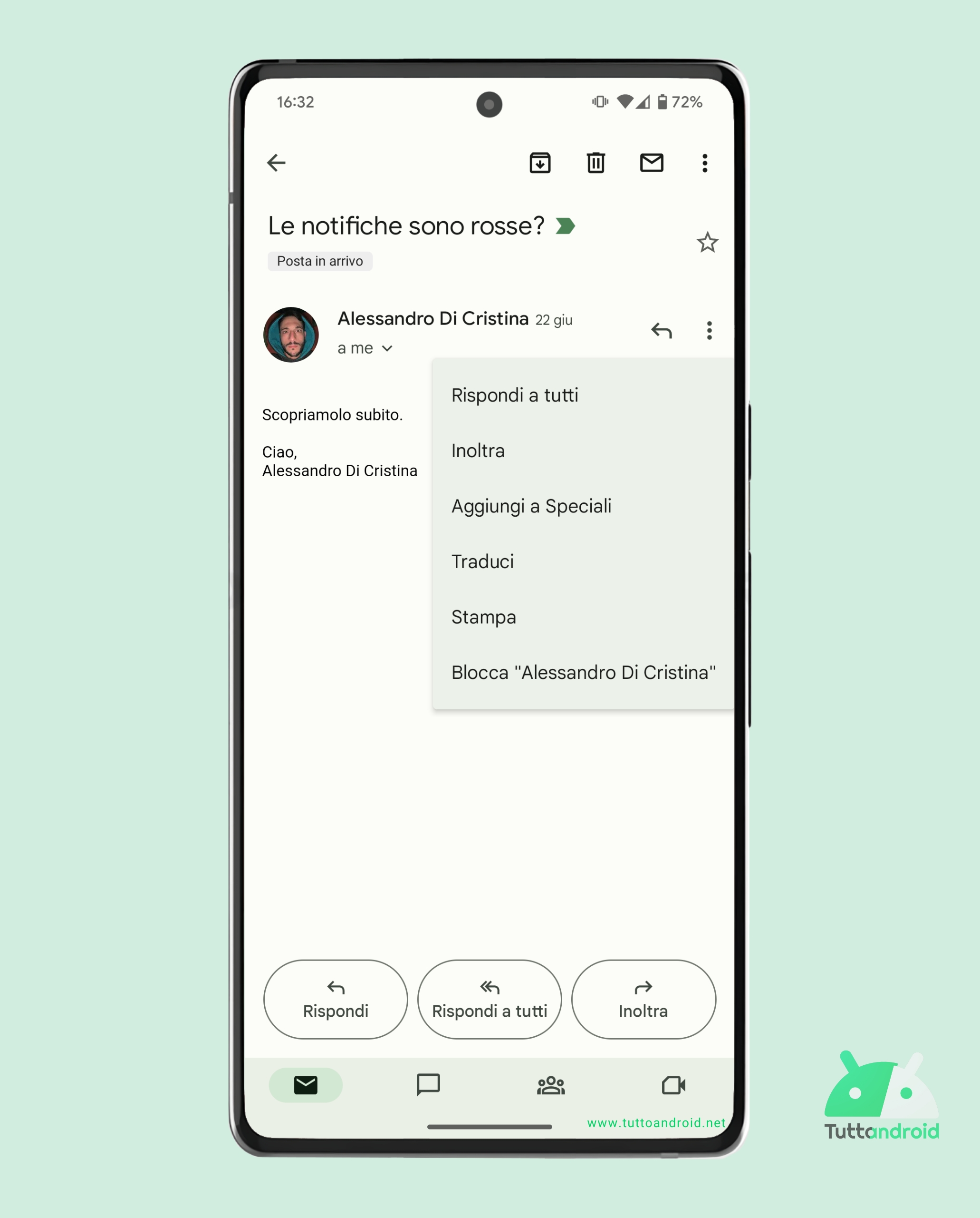 Utilizzare la nuova funzione di traduzione delle mail su Gmail è un’operazione molto semplice (illustrata nella galleria sottostante): innanzitutto è necessario aprire la mail che si desidera tradurre; una volta dentro, basterà selezionare la voce “Traduci” dal menu contestuale (che si apre effettuando un tap sui tre pallini presenti all’estrema destra della riga del mittente).