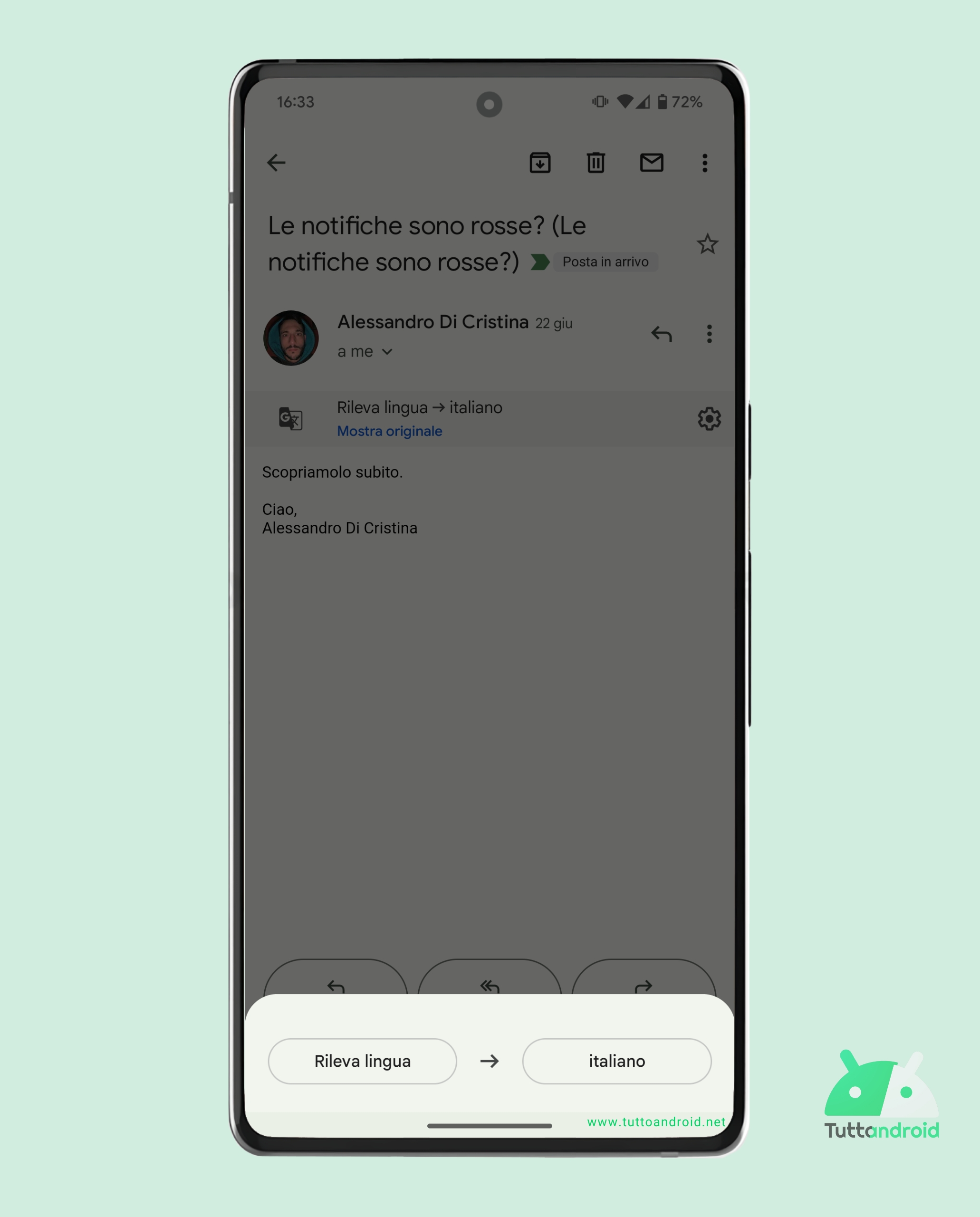 A questo punto Gmail tradurrà la mail nella lingua di sistema, preoccupandosi di rilevare automaticamente la lingua originale della mail stessa (apparirà un banner apposito che segnala la traduzione e consente di rivedere la mail originale): l’utente potrà comunque scegliere manualmente sia la lingua da cui tradurre che quella in cui tradurre.