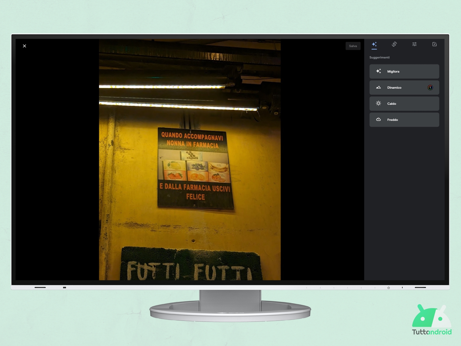 Cliccando sull’icona indicata da “Prova il nuovo editor”, veniamo accolti dalla sezione “Suggerimenti” dell’editor che ci permette di scegliere rapidamente una tra quattro opzioni di modifica automatica: Migliora, Dinamico (esclusiva degli abbonati a Google One), Caldo e Freddo.