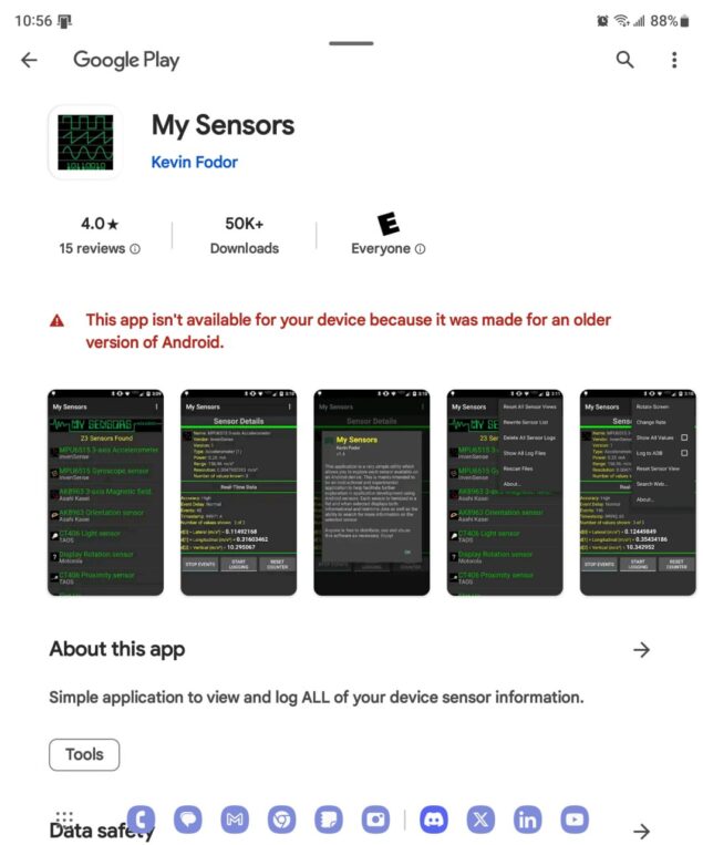 Emerge un caso specifico di un’app chiamata My Sensors, un’app che in soldoni permette di visualizzare il log catturato da tutti i sensori del dispositivo su cui viene installata. In generale, quindi, è la classica app che non necessita di aggiornamenti annuali.