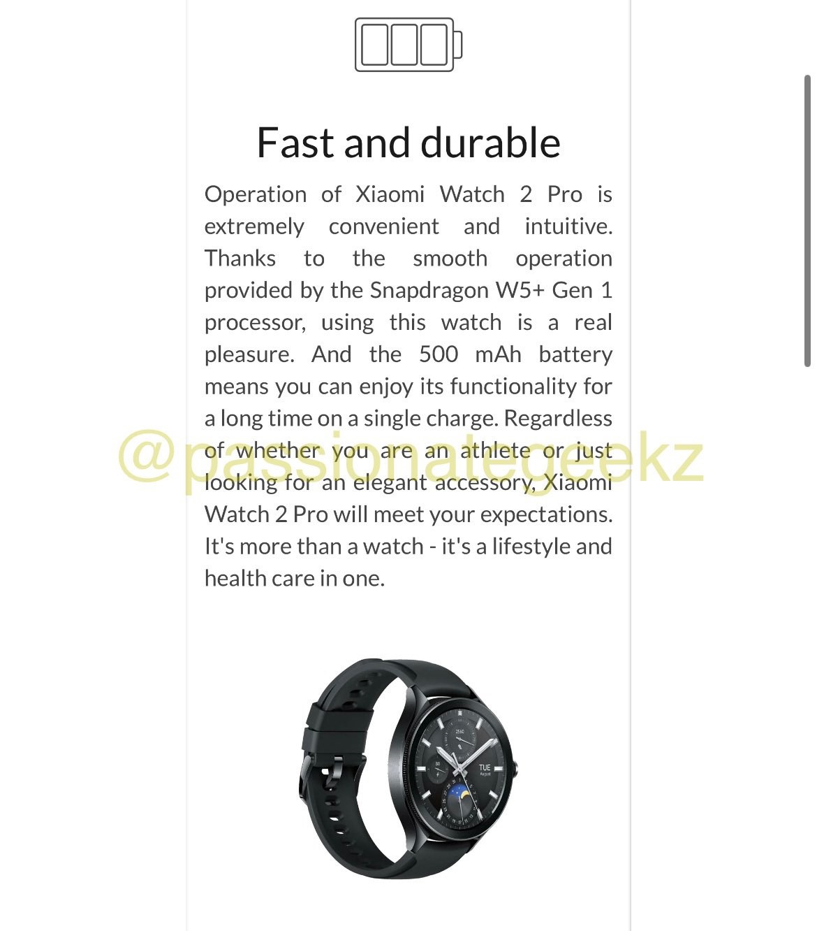 Secondo quanto emerso Xiaomi Watch 2 Pro adotterebbe una cassa in acciaio inossidabile con corona girevole e e sfoggerebbe un quadrante OLED da 1,43 pollici, 326 PPI con protezione Gorilla Glass. Lo smartwatch adotterebbe il chipset Snapdragon W5+ e sarebbe alimentato da una batteria da 500 mAh, inoltre sarebbe impermeabile fino a 5 ATM.