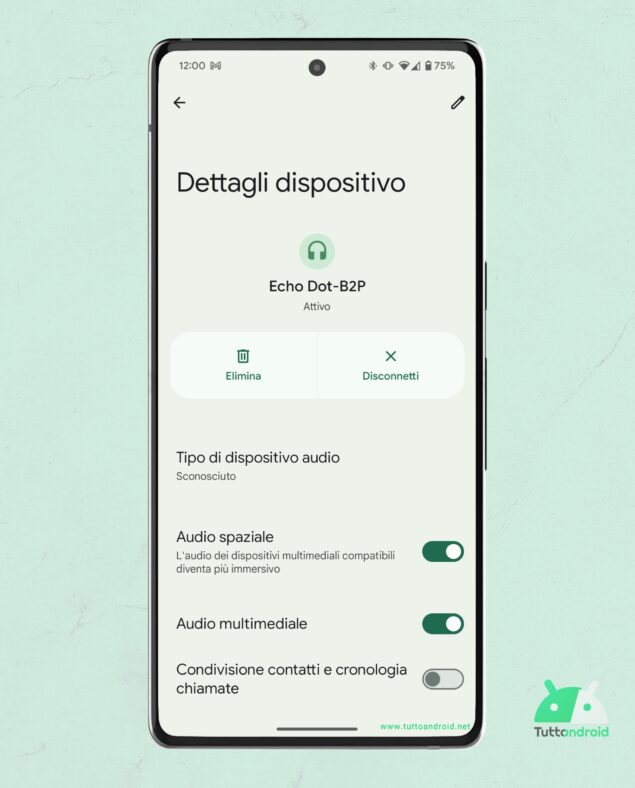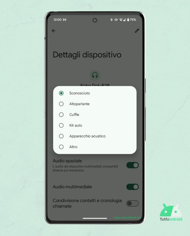 Quando si connette allo smartphone un dispositivo Bluetooth, nel mio caso un Amazon Echo Dot, con la beta 1 di Android 14 QPR1 viene aggiunta una nuova voce al menu “Dettagli dispositivo” che consente di specificare la tipologia del dispositivo audio che è stato connesso.