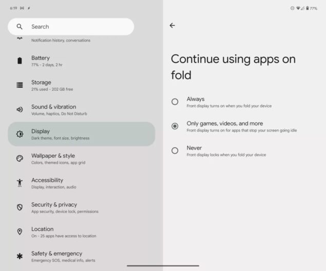 Il Google Pixel Fold beneficerà di una nuova potenzialità quando verrà rilasciato Android 14 QPR1: la beta 1, infatti, introduce già una nuova funzionalità (via AndroidAuthority) che permette all’utente di continuare a fare ciò che stava facendo a smartphone aperto anche sullo smartphone chiuso. Tale funzionalità si regola tramite un apposito menu (raggiungibile al percorso “Impostazioni > Display“) e consente di scegliere all’utente se abilitare il comportamento per giochi e video, sempre o mai.