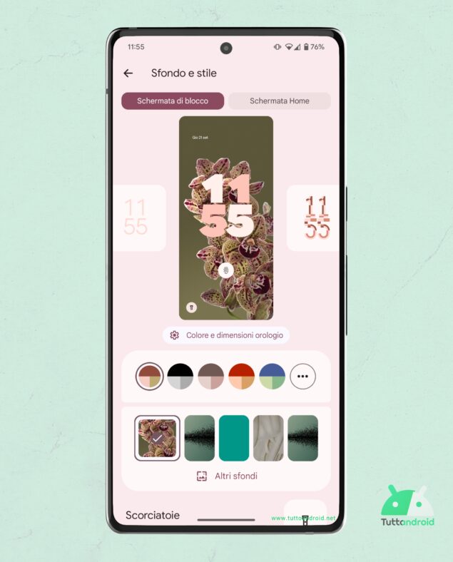 Partiamo con la rassegna delle novità e soffermiamoci subito sulle novità in ambito “personalizzazione”, uno dei focus di Android 14 che va a introdurre la schermata di blocco personalizzabile (con possibilità di modificare il design dell’orologio e di scegliere le scorciatoie da mostrare tra un set di dieci diverse opzioni). In questo ambito, emergono due piccole novità, già disponibili per tutti installando la beta 1 di Android 14 QPR1.