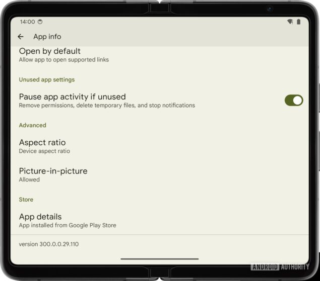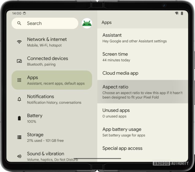 Con la beta 1 di Android 14 QPR1, Google ha aggiunto una nuova funzionalità al menu “Impostazioni > App” chiamata “Aspect ratio” (immaginiamo venga tradotta come “proporzioni” o “fattore di forma”), molto utile sui dispositivi dal grande schermo (come Pixel Fold e Pixel Tablet).