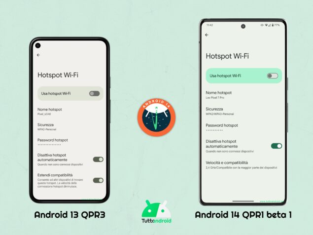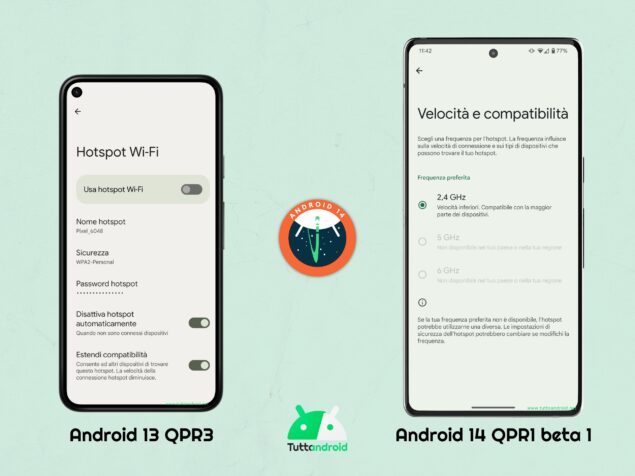 Una novità già avvistata con la beta 2 di Android 14 (dello scorso maggio) è ora visibile per tutti con la beta 1 di Android 14 QPR1: al menu “Impostazioni > Rete e internet > Hotspot e tethering > Hotspot Wi-Fi” non è più presente l’opzione “Estendi compatibilità”, ora sostituita dal nuovo menu “Velocità e compatibilità” che consente all’utente di scegliere la frequenza dell’hotspot Wi-Fi tra “2,4 GHz”, “5 GHz” e “6 GHz”.