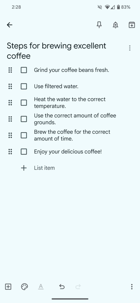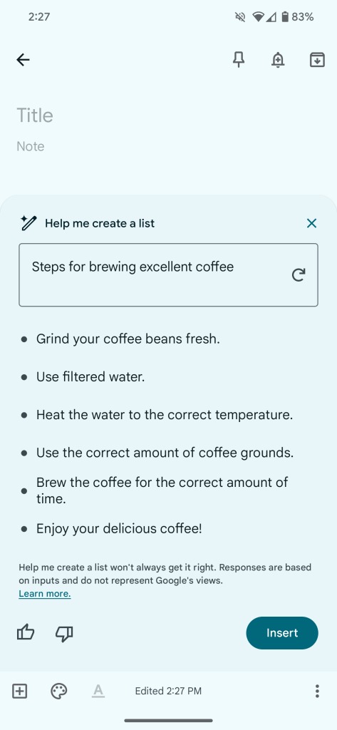 Come potete notare dalle immagini presenti nella galleria poco sopra, i colleghi hanno chiesto a Google Keep di creare un elenco contenente i passaggi necessari per preparare un buon caffè: i risultati proposti dall’IA sono da intendersi come una sorta di suggerimento, l’utente ha infatti la possibilità di salvare l’elenco così com’è o apportare tutte le modifiche che ritiene necessarie.