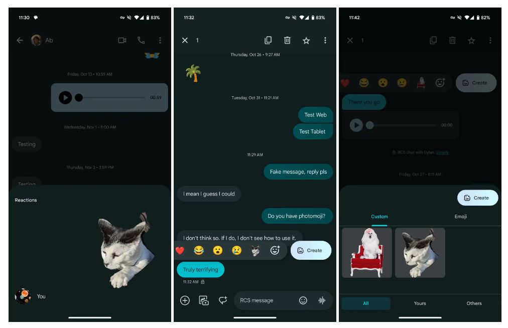 Gli utenti possono aggiungerne di nuovi premendo a lungo su un SMS o su una chat RCS e scorrendo fino alla fine della barra delle reazioni per selezionare “Crea” (questo pulsante è disponibile anche nel selettore emoji per crearne di nuove senza doverle prima inviare).