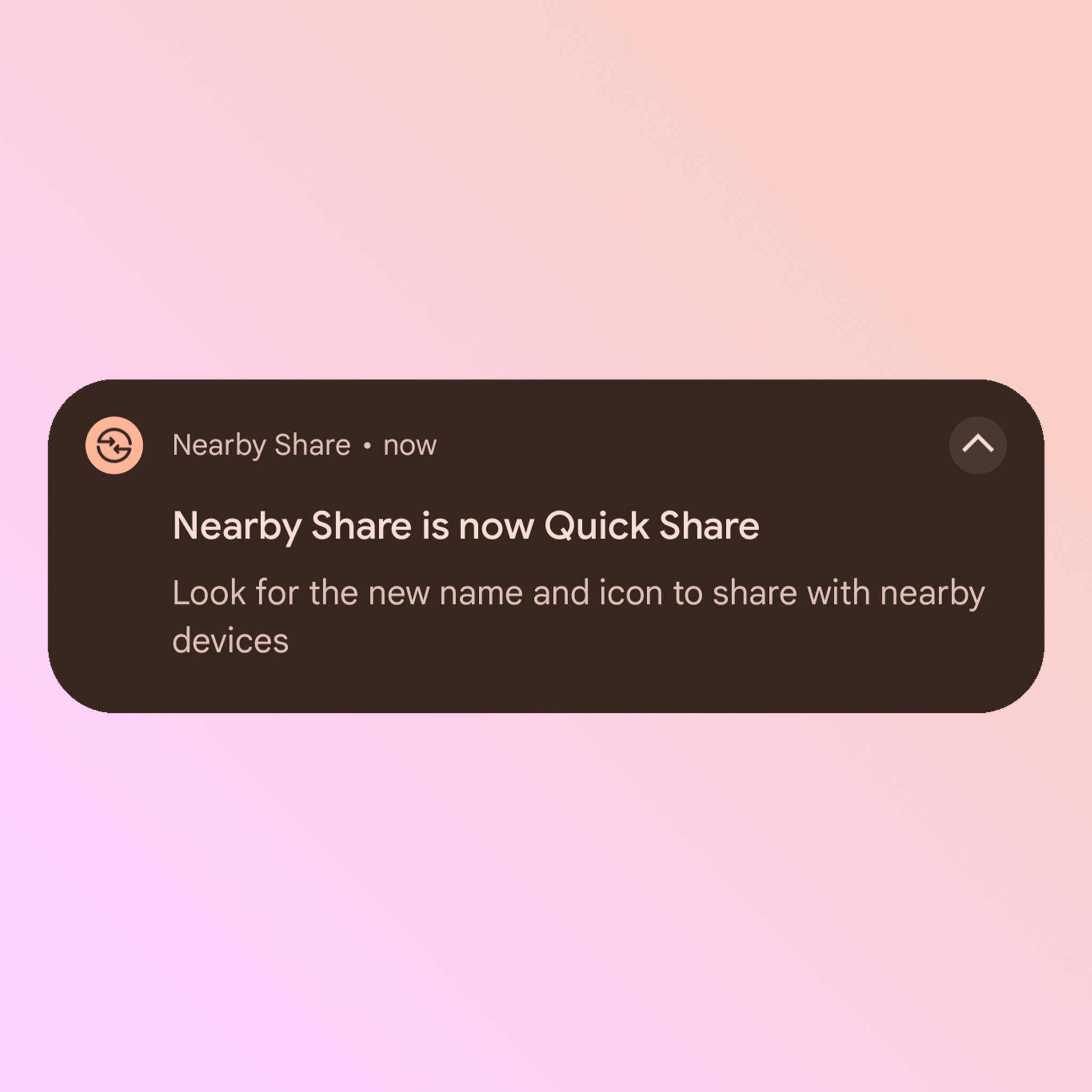 Con la versione 23.50.13 dei Google Play Services, ha scovato alcune indicazioni sulla possibile unione dei due servizi, che potrebbero fondersi e chiamarsi semplicemente Quick Share. La prima, e la più lampante, è costituita dalla notifica che avvisa che “Nearby Share is now Quick Share“, che cita il nuovo nome e la nuova icona della funzione per condividere. Nelle immagini qui sotto possiamo anche dare uno sguardo alla schermata con il nuovo nome, così come alla nuova icona visibile sia nelle notifiche sia nel riquadro delle impostazioni rapide.