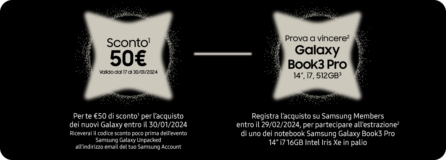 Ma c’è anche un’altra promozione legata al lancio di Samsung Galaxy S24: chi acquisterà uno dei nuovi smartphone di Samsung entro il 30 gennaio 2024 e lo registrerà sul sito dedicato (lo trovate seguendo questo link) entro il 29 febbraio 2024, infatti, avrà la possibilità di partecipare all’estrazione per vincere uno tra i 14 notebook Samsung Galaxy Book3 Pro 14″ i7 16GB Intel Iris Xe in palio.