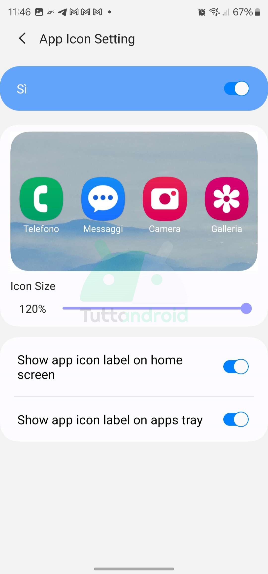 Tornando a noi, Home Up si aggiorna in queste ore alla versione 15.0.01.19 tramite il Galaxy Store e introduce una nuova sezione “App Icon Setting”, nella quale non solo sono state spostate le opzioni per scegliere se mostrare o meno i nomi delle applicazioni sotto le icone, ma è stata aggiunta la possibilità di modificare la dimensione delle icone stesse. Come possiamo vedere negli screenshot qui sotto, l’app offre ora uno slider per procedere con la modifica, che va dall’80% (per chi vuole icone più piccole rispetto a quelle standard) fino al 120% (per chi le preferisce ancora più grandi).