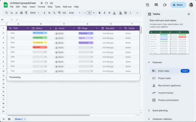 La nuova funzione permette di creare tabelle in modo estremamente rapido, con filtri e regole di ordinamento, e sarà direttamente Fogli a creare un nome per la stessa e l’intestazione di ogni colonna. Inoltre, Google ha introdotto una nuova opzione di visualizzazione denominata “Create group by view”, che consente agli utenti di raggruppare i dati in base ai filtri delle colonne (ad esempio per priorità), e le tabelle predefinite, che gli utenti possono compilare per le varie attività quotidiane.
