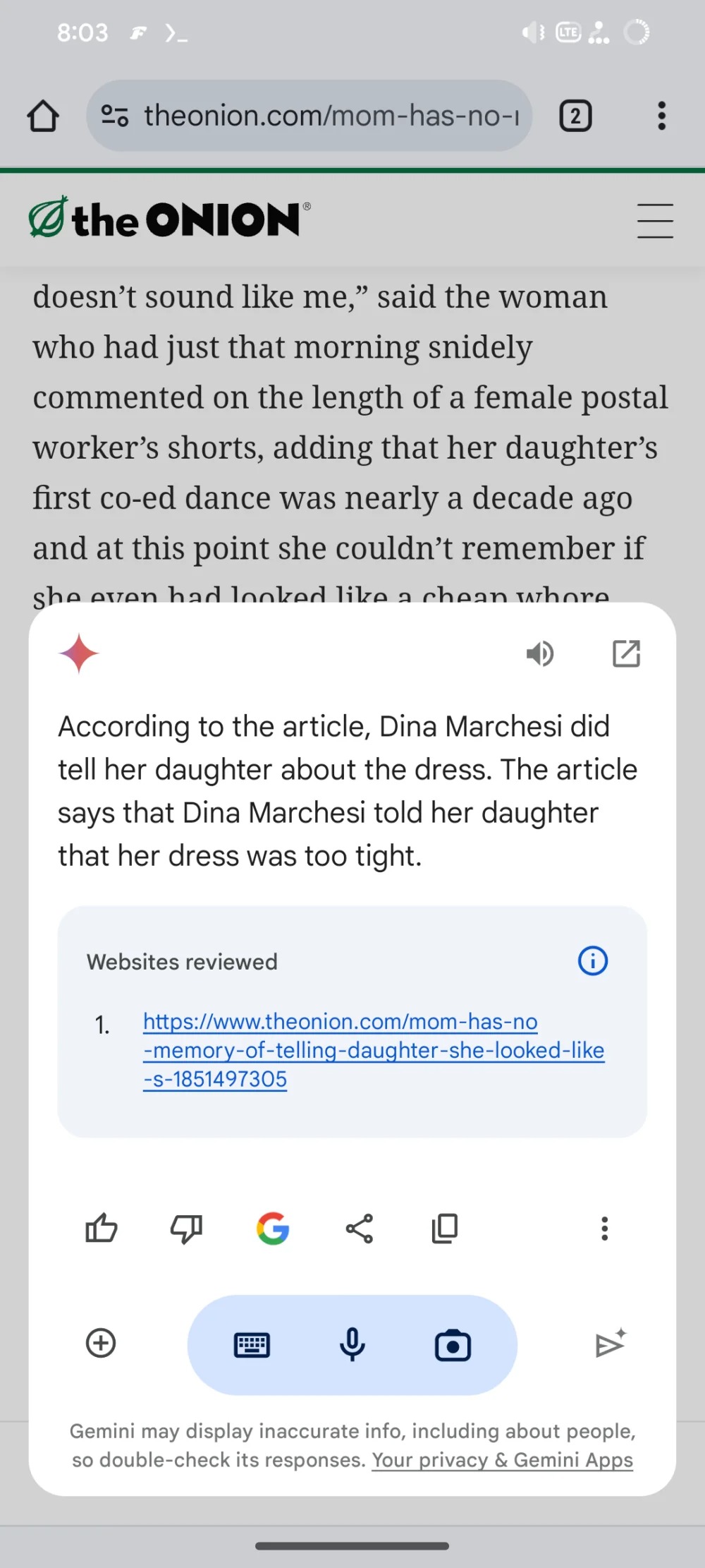 Ma come se la cava Gemini con informazioni false? Nella seconda prova i colleghi hanno provato a fargli analizzare una pagina web con un contenuto satirico e a fare domande al riguardo: l’IA ha risposto in modo diligente a quanto richiesto, ma senza rendersi conto che si trattasse di un fatto “inventato” da parte di una pagina celebre per i contenuti satirici. A mettere “al riparo” Google c’è la dicitura “Gemini may display inaccurate info, including about people, so double-check its responses“, ma sembra piuttosto chiaro che ci sia ancora qualcosa da migliorare, perlomeno per la corretta comprensione del contesto in sé. Di fatto, questo secondo esempio fa sembrare la funzione Ask this page una versione più complessa di un “normale” riepilogo IA.