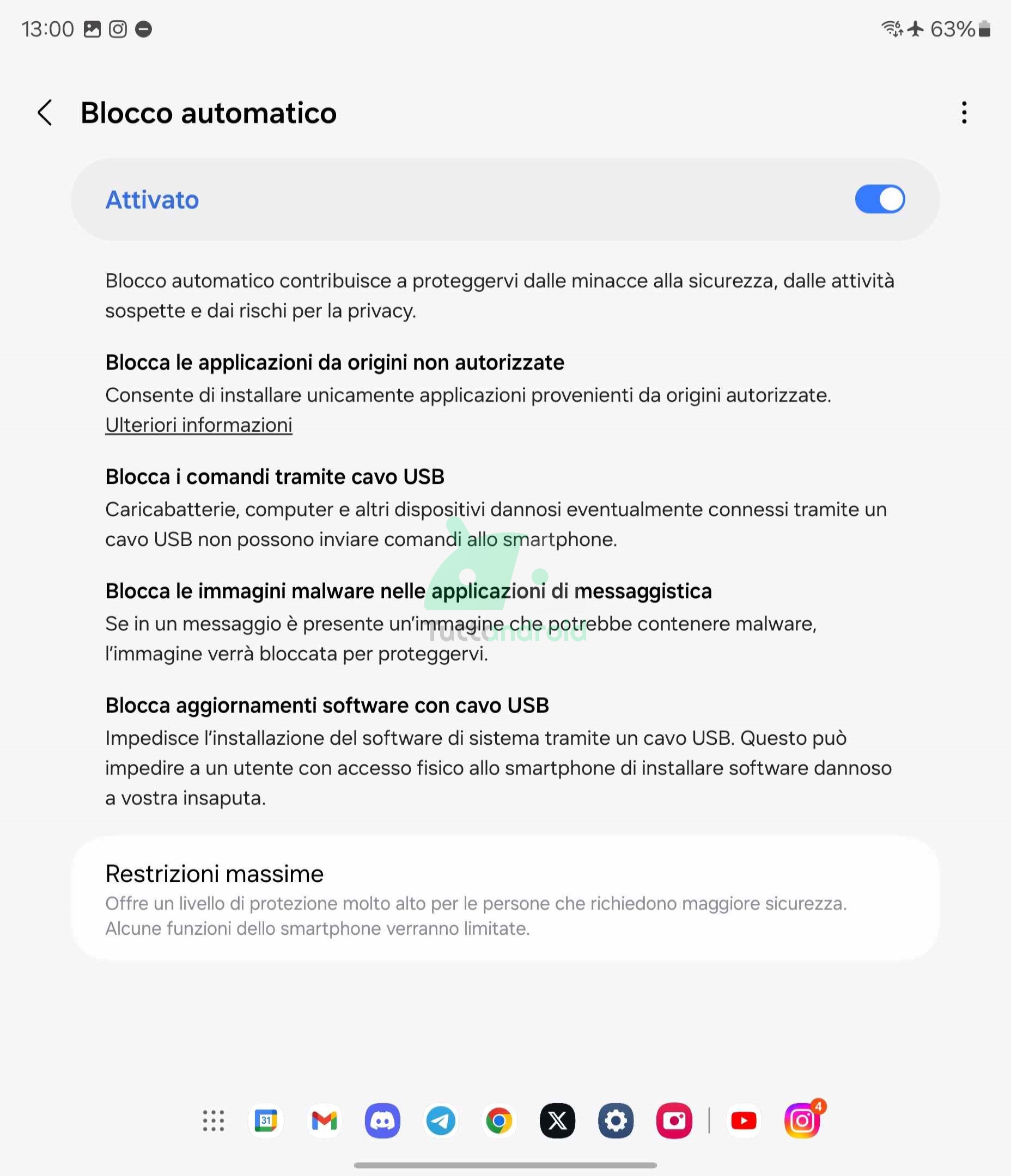 Con la più recente versione del sistema operativo, all’interno di Blocco automatico è comparsa anche una nuova sezione denominata “Restrizioni massime“, con funzioni che offrono un livello di protezione ancora più alto. Al suo interno troviamo ad esempio il controllo delle app, il blocco che impedisce l’attivazione delle applicazioni di amministrazione del dispositivo e dei profili di lavoro, il blocco dei collegamenti ipertestuali e delle anteprime, il blocco degli album condivisi e non solo. Samsung stessa avvisa infatti che l’attivazione di queste ulteriori restrizioni (c’è un toggle separato) limita alcune funzioni dello smartphone.