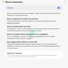 Con la One UI 6.0 Samsung ha introdotto su smartphone e tablet Android la funzione Blocco automatico, utile per la sicurezza e disponibile all’interno delle impostazioni di sistema (la trovate in “Impostazioni > Sicurezza e privacy > Blocco automatico“). Se attivata, aiuta a proteggere il dispositivo Samsung Galaxy impedendo l’installazione di app da origini non autorizzate, verificando la presenza di malware e bloccando eventuali attività dannose; vengono bloccati comandi inviati allo smartphone da parte di caricabatterie, computer e altri dispositivi che potrebbero risultare dannosi e che siano stati eventualmente collegati tramite cavo USB, impediti aggiornamenti software tramite cavo USB e bloccate immagini che potrebbero contenere malware nelle applicazioni di messaggistica.