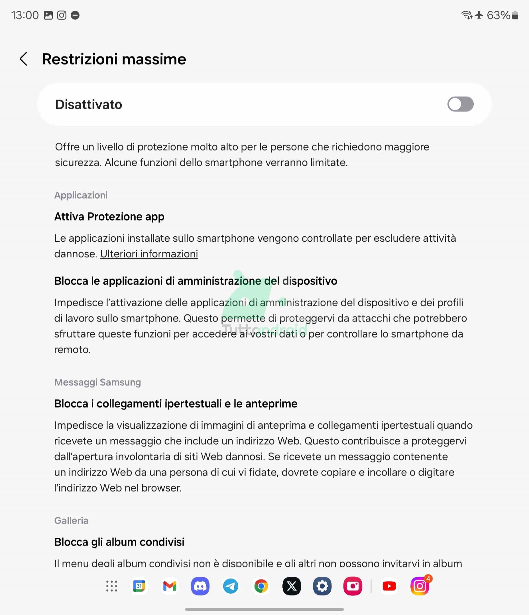 Con la più recente versione del sistema operativo, all’interno di Blocco automatico è comparsa anche una nuova sezione denominata “Restrizioni massime“, con funzioni che offrono un livello di protezione ancora più alto. Al suo interno troviamo ad esempio il controllo delle app, il blocco che impedisce l’attivazione delle applicazioni di amministrazione del dispositivo e dei profili di lavoro, il blocco dei collegamenti ipertestuali e delle anteprime, il blocco degli album condivisi e non solo. Samsung stessa avvisa infatti che l’attivazione di queste ulteriori restrizioni (c’è un toggle separato) limita alcune funzioni dello smartphone.