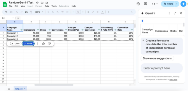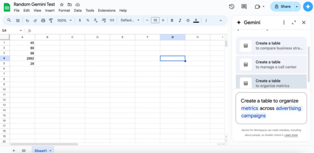 Il pannello laterale di Gemini offre anche suggerimenti su come personalizzare il prompt per creare una tabella ben fatta, indicando inoltre quali parti modificare. Nel mese di agosto, Google aveva già lanciato una funzione per “convertire in tabella”, che creava tabelle testuali molto semplici, ma non era ciò che era stato presentato all’evento.