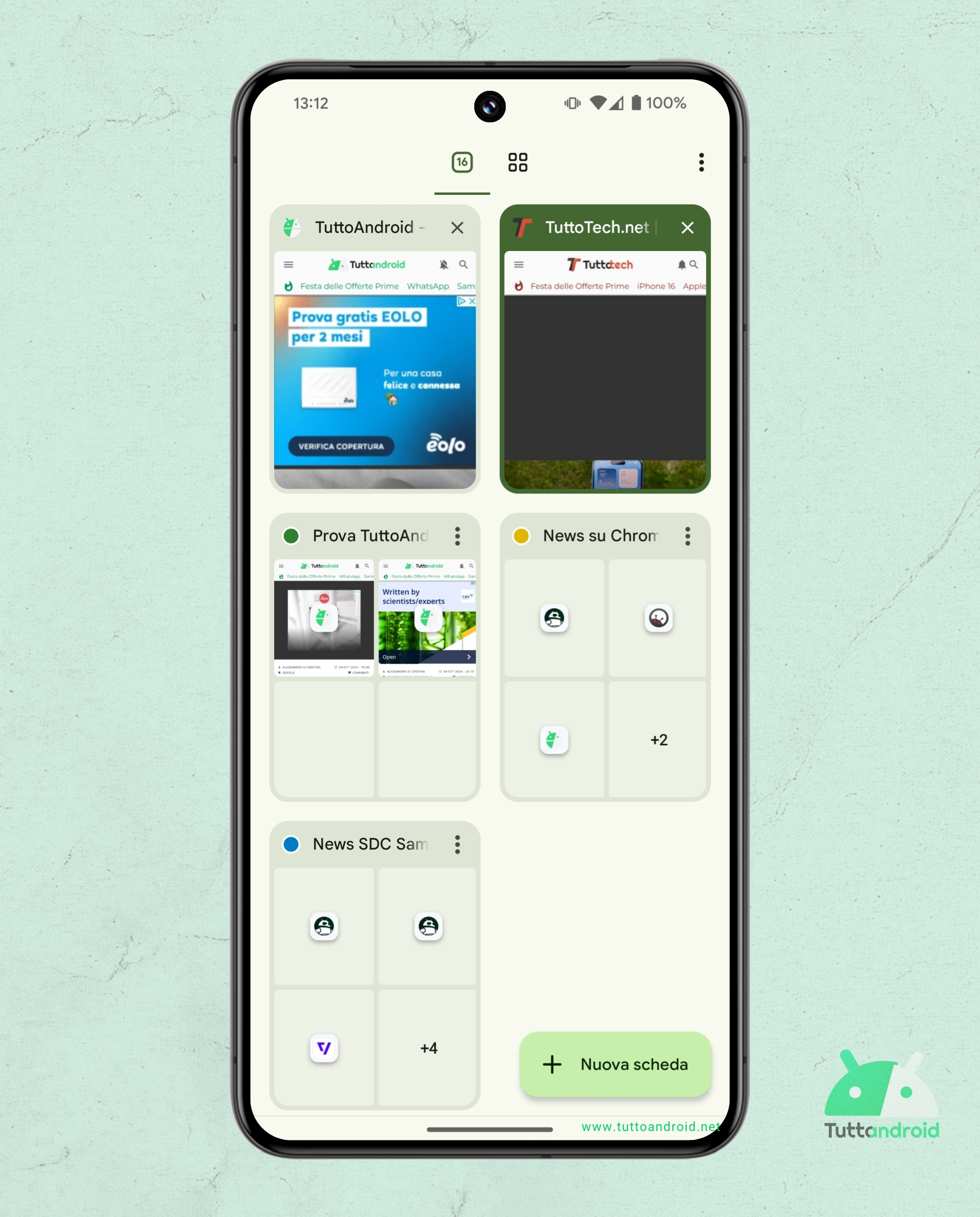 Il FAB (Floating Action Button, ovvero il pulsante “flottante”) non cambia la sostanza o il funzionamento, andando esclusivamente a sostituire a sostituire il “+ Nuova scheda” (precedentemente collocato in alto a sinistra) nella schermata con le schede e i gruppi di schede aperti. Come potete vedere dalla prima immagine della seguente galleria, il nuovo pulsante flottante segue è compatibile coi colori dinamici.