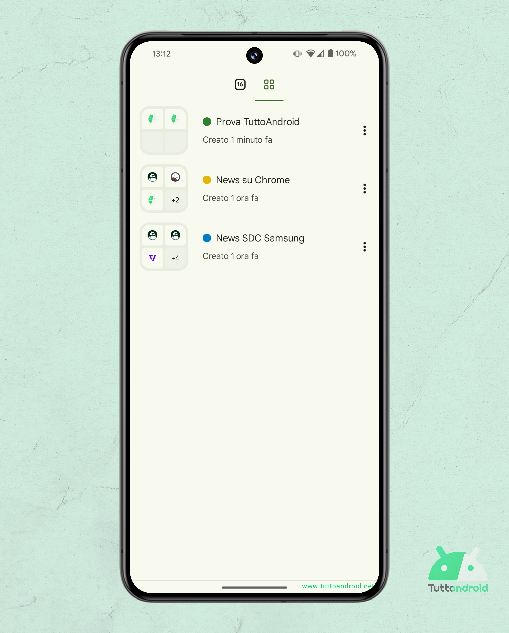 La seconda novità è rappresentata da una pagina che racchiude al suo interno tutti i gruppi di schede salvati dall’utente su Chrome (seconda immagine della seguente galleria), ammesso che per essi sia stata selezionata l’opzione “Salva gruppo”. In questa pagina non compariranno le singole schede che restano invece presenti nella schermata con tutte le schede e i gruppi di schede aperti.