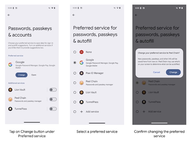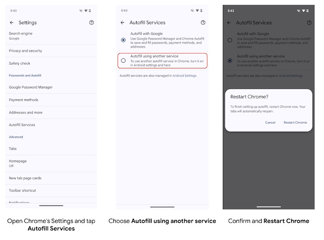 La funzionalità è già disponibile dalla versione beta di Chrome 131 ed è attivabile innanzitutto impostando un servizio di riempimento automatico di terze parti in Android 14. Per farlo è necessario accedere al menu Impostazioni di Android, quindi Password, chiavi di accesso e account, selezionare Cambia, scegliere il servizio preferito e confermare la modifica.