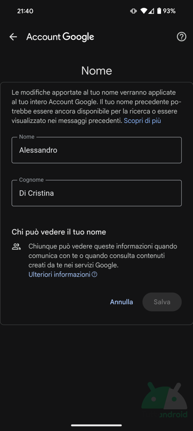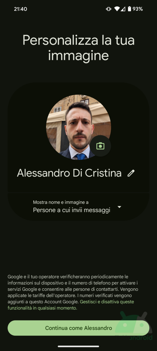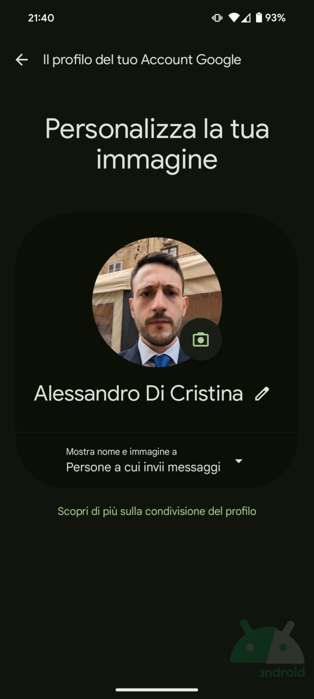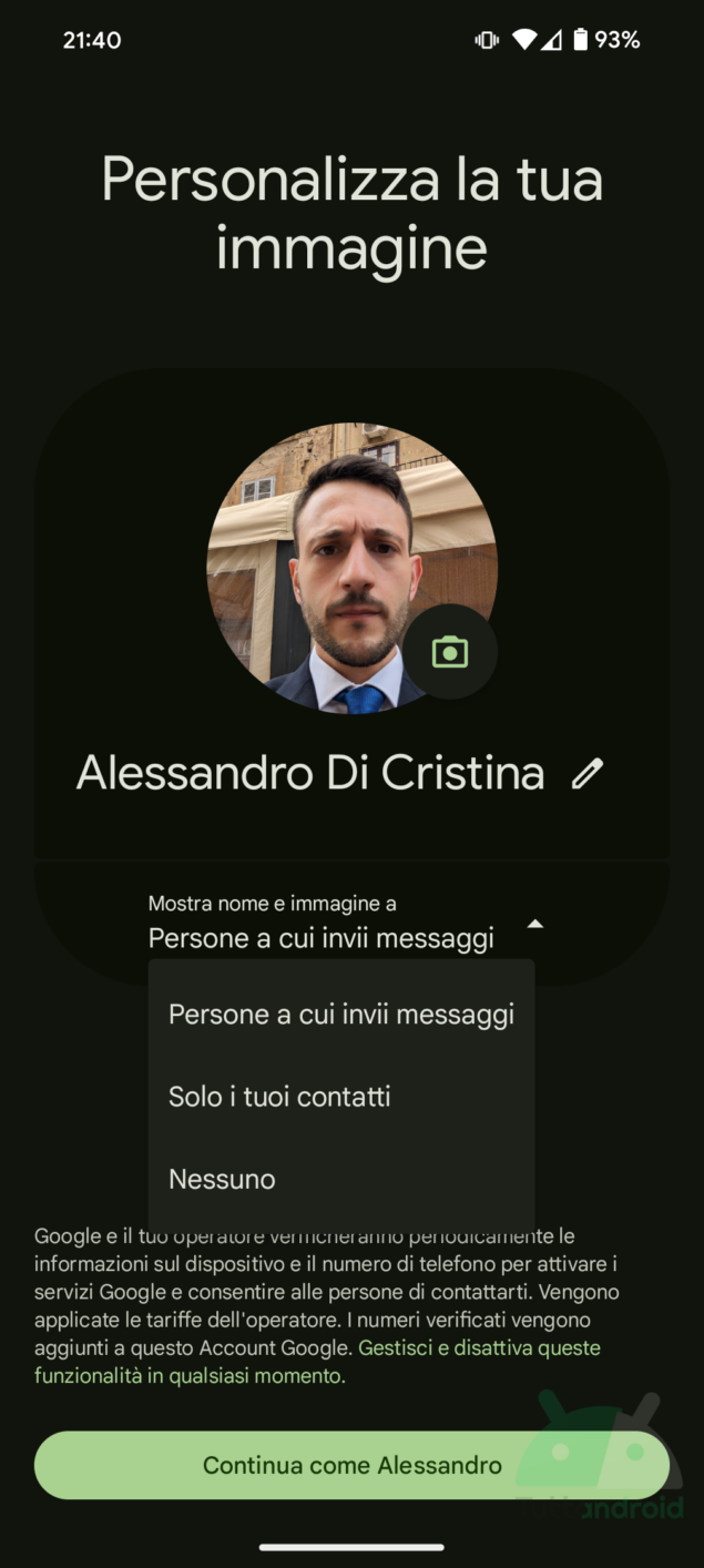 Nella schermata iniziale è possibile modificare il nome e l’immagine del profilo e premendo per farlo si apre il menu delle impostazioni dell’Account Google. Sotto c’è un menu a discesa “Mostra nome e immagine a” che consente di scegliere tra tre opzioni: Persone a cui invii messaggi, Solo i tuoi contatti e Nessuno.
