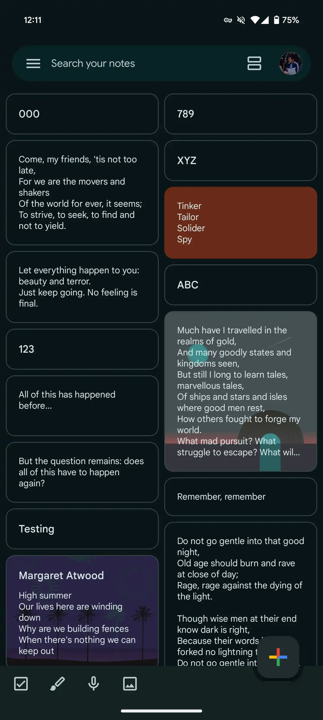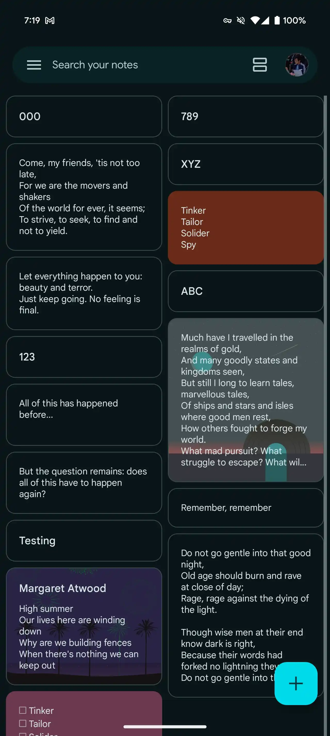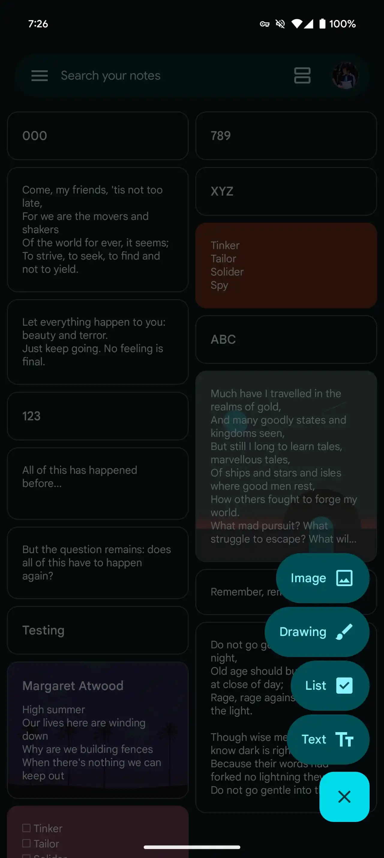 Come potete vedere dagli screenshot seguenti, Google Keep abbandona la barra di cui sopra in favore di un solo tasto “+”, che conserva inalterata la forma, ma perde i colori, adattandosi al sistema Dynamic Color del Material You. Cambia anche il comportamento del tasto in questione: mentre in precedenza bastava un singolo tocco per iniziare a scrivere una nota testuale, adesso il primo tocco serve ad aprire le pillole delle quattro modalità disponibili — Immagine, Disegno, Elenco, Testo —, rendendone così necessario un secondo per iniziare a creare la nota. Sparisce, dunque, la voce dedicata alle note audio: è possibile iniziare a registrare solo dopo aver già creato una nota; pur in mancanza di conferme ufficiali, non si può fare a meno di pensare che questa scelta di Google sia figlia della consapevolezza che, esistendo un’app dedicata e avanzata come Google Recorder, la creazione di note audio tramite Keep non rappresenti più una priorità per gli utenti.