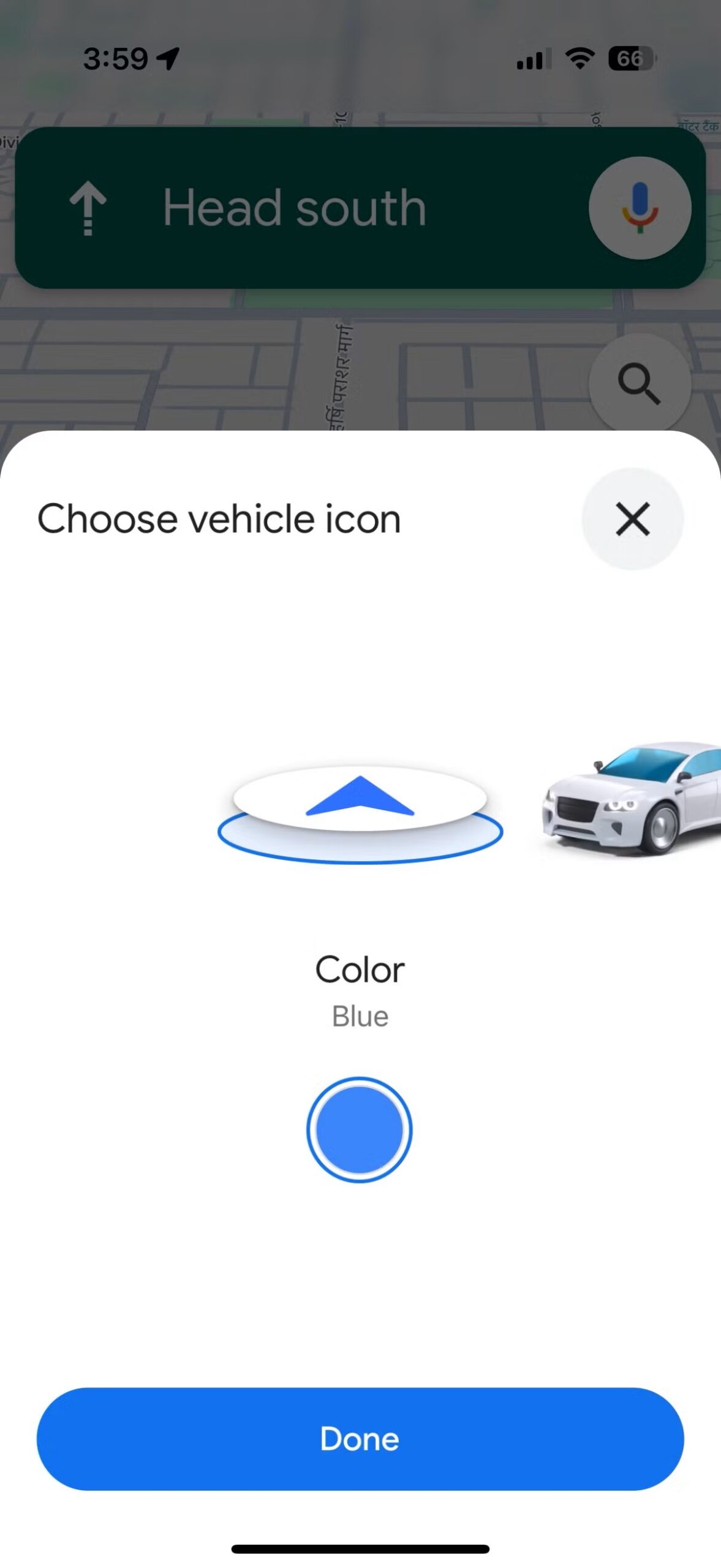 L’app di navigazione Google Maps consente di passare dall’icona di navigazione predefinita che mostra una freccia blu a un marcatore che mostra tre icone di veicoli, ovvero un’auto rossa, un SUV giallo e un pick-up verde.