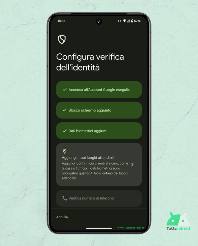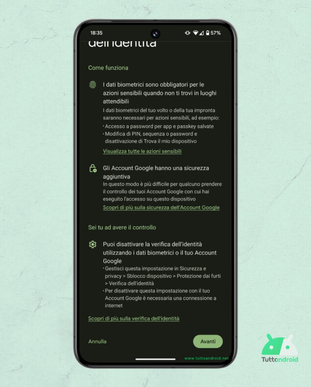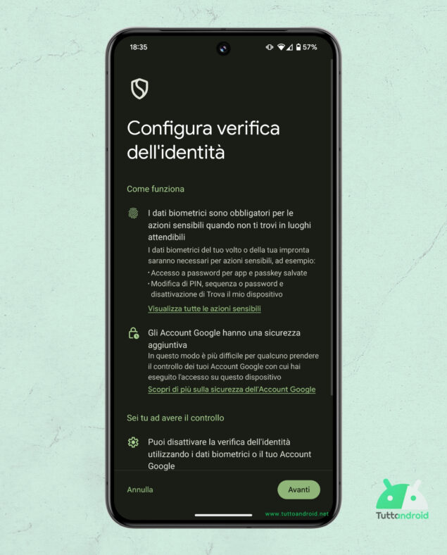 Lo scorso 5 dicembre, con l’annuncio del Pixel Drop, abbiamo avuto conferma del fatto che la funzionalità fosse pronta e sarebbe stata rilasciata a breve: in soldoni, quando attiva, la Verifica dell’identità fa sì che l’utente debba effettuare una autenticazione biometrica (tramite volto o tramite impronta digitale) prima di potere apportare modifiche sensibili sul dispositivo (come l’accesso a password e passkey salvate, la modifica di PIN/segno/password di sblocco, la disattivazione di Trova il mio dispositivo).